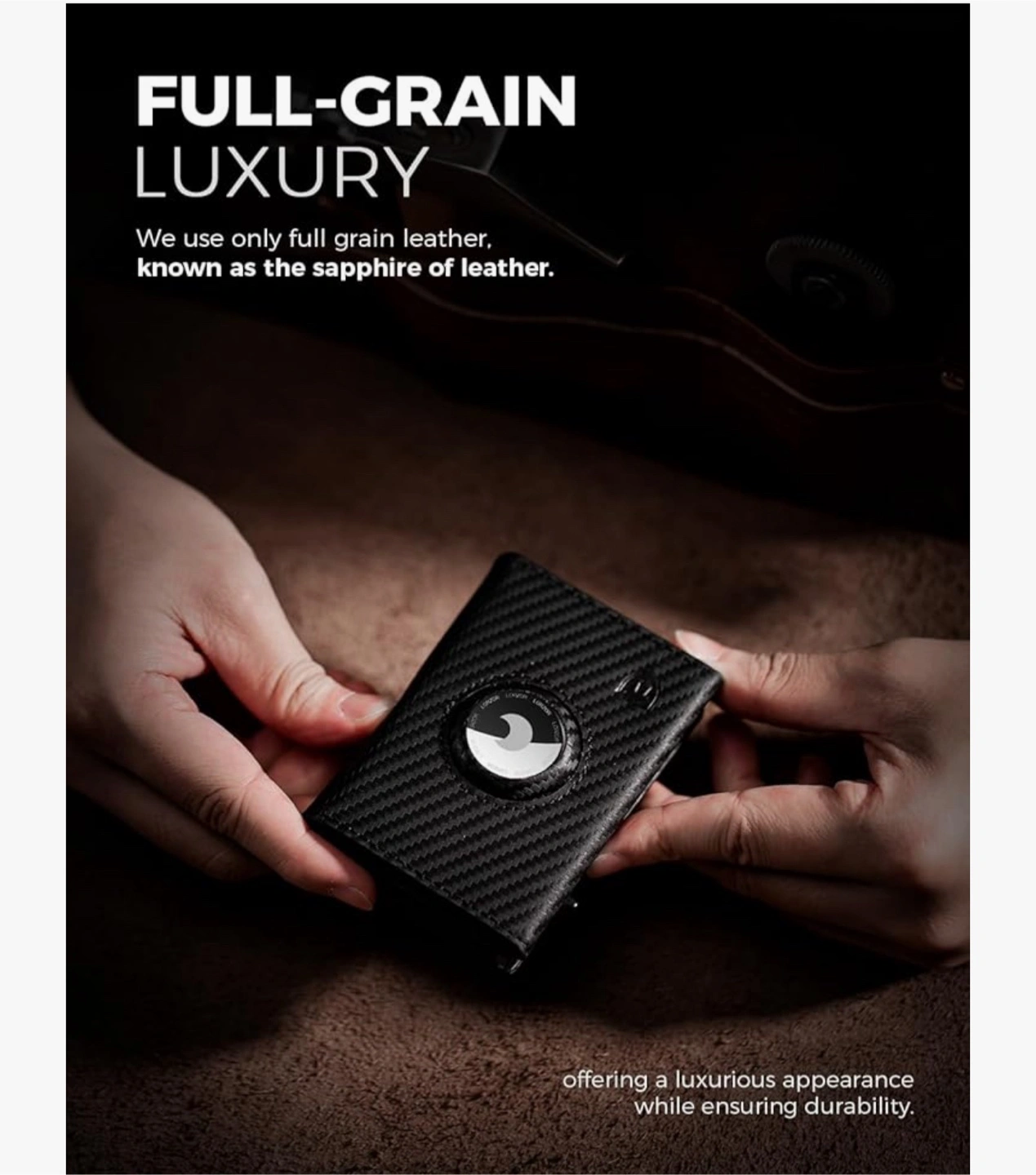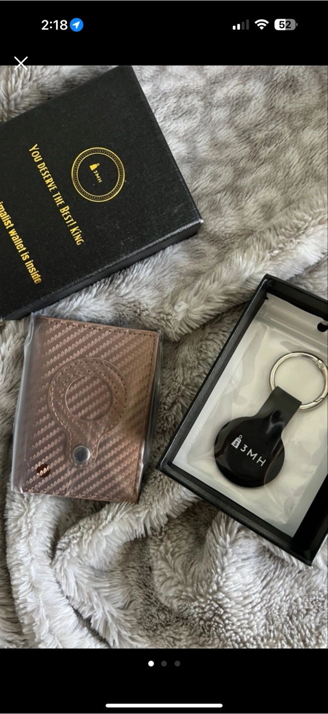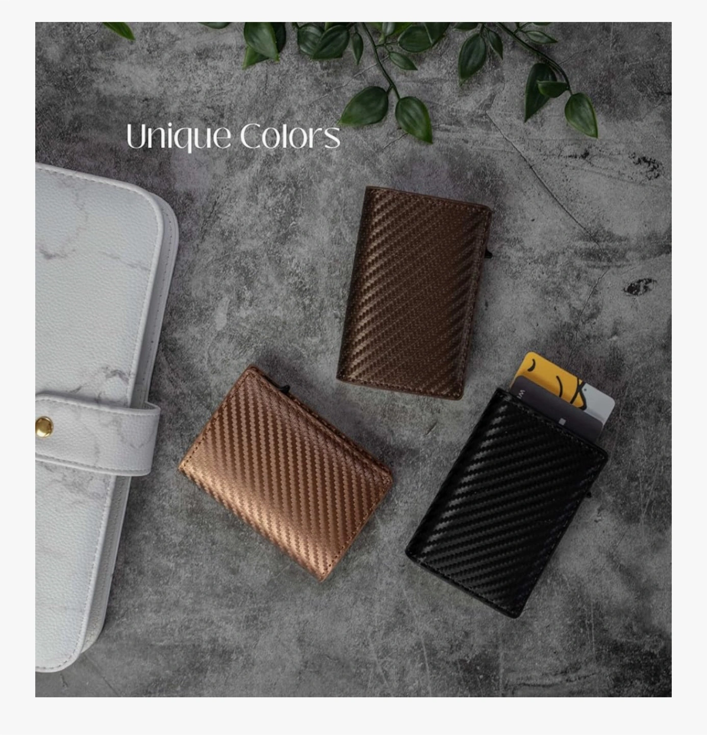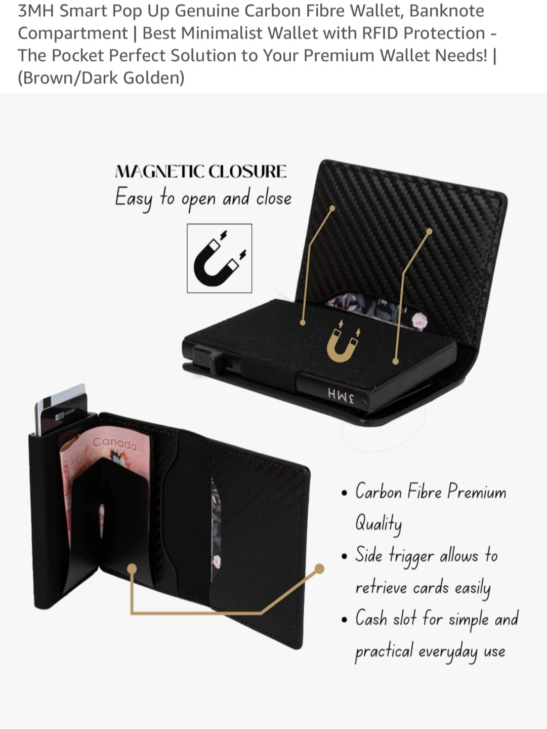 Smart Pop Up wallet is brand new and comes in its original box! It's made of carbon fibre. It features a magnetic closure, side trigger for easy card retrieval, and a cash slot. Color: light and dark brown (black sold out) Pick up Parklawn & lakeshore