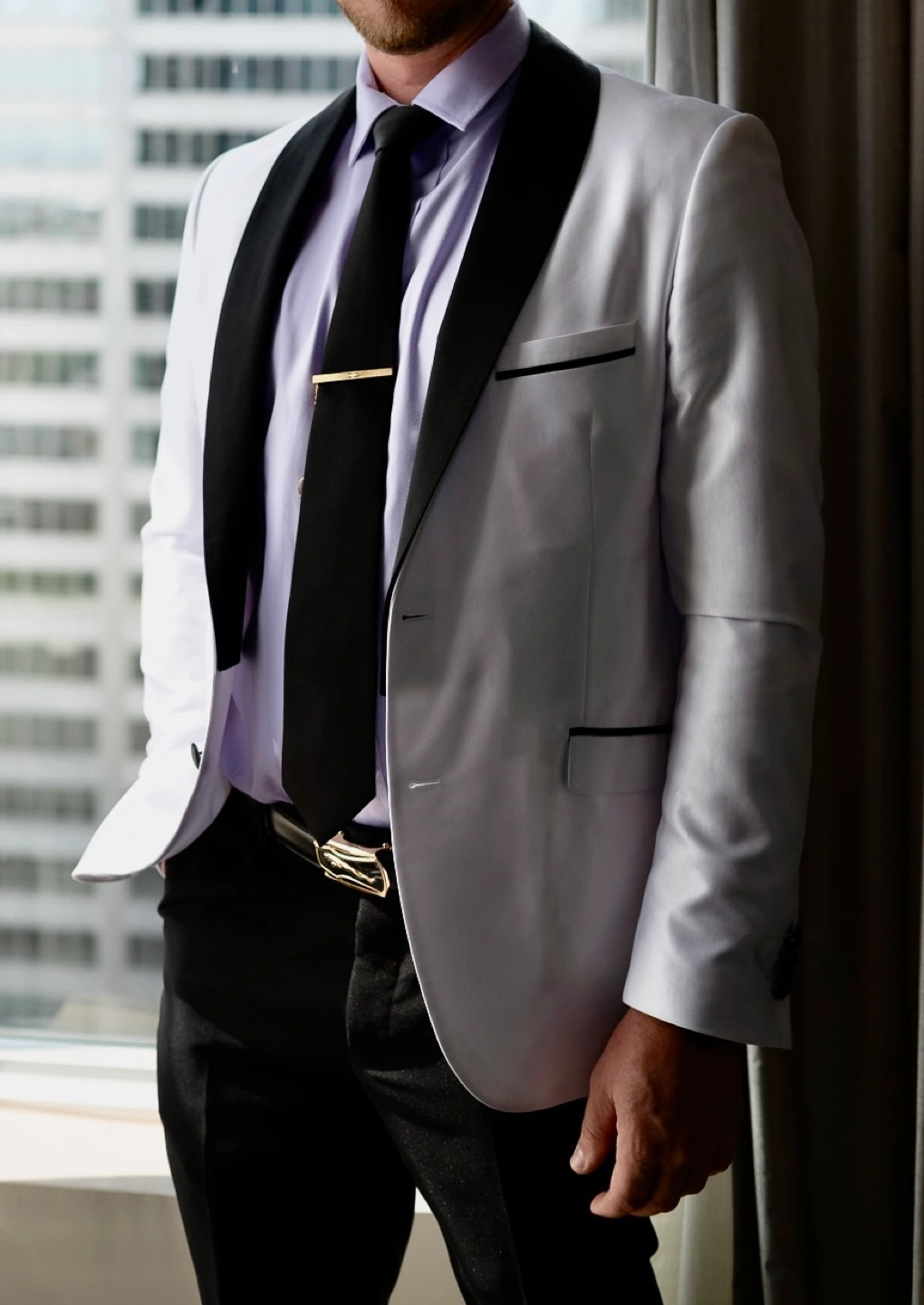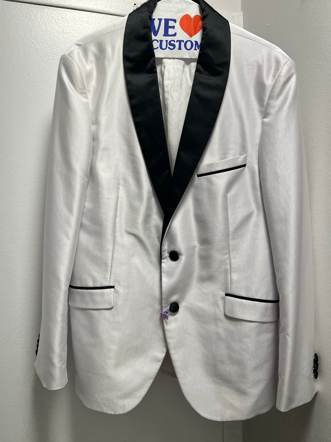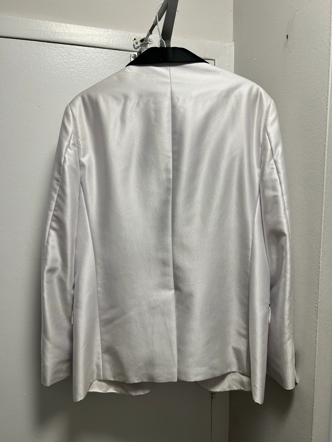 White tuxedo-style blazer. Features a black shawl collar and subtle black piping. Two-button closure. Excellent for formal occasions. Dry cleaned. Pick up Eglington and Royal York