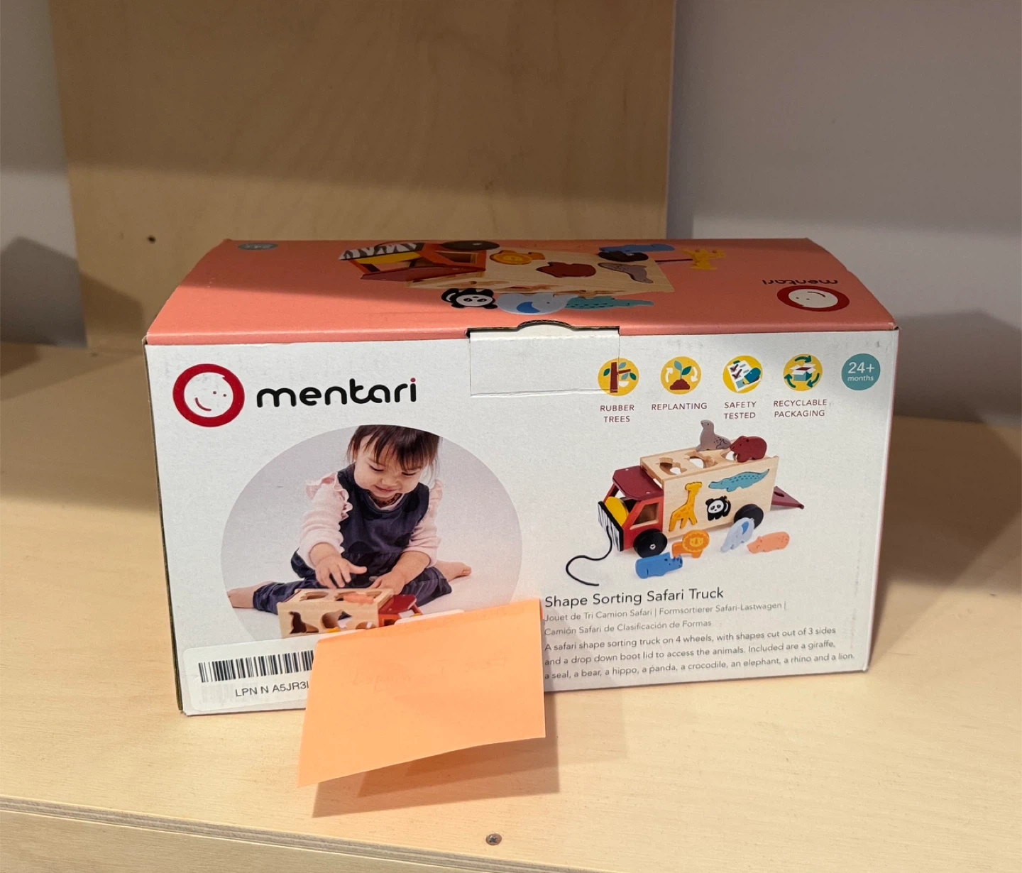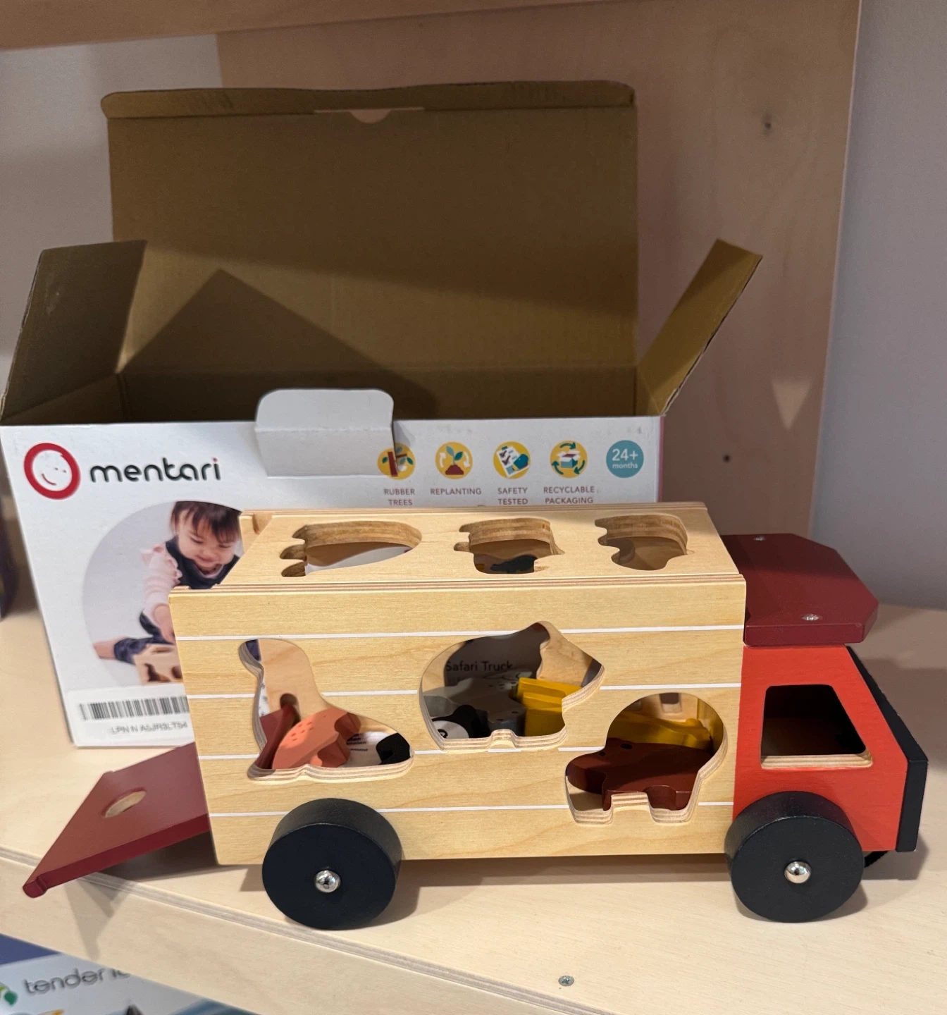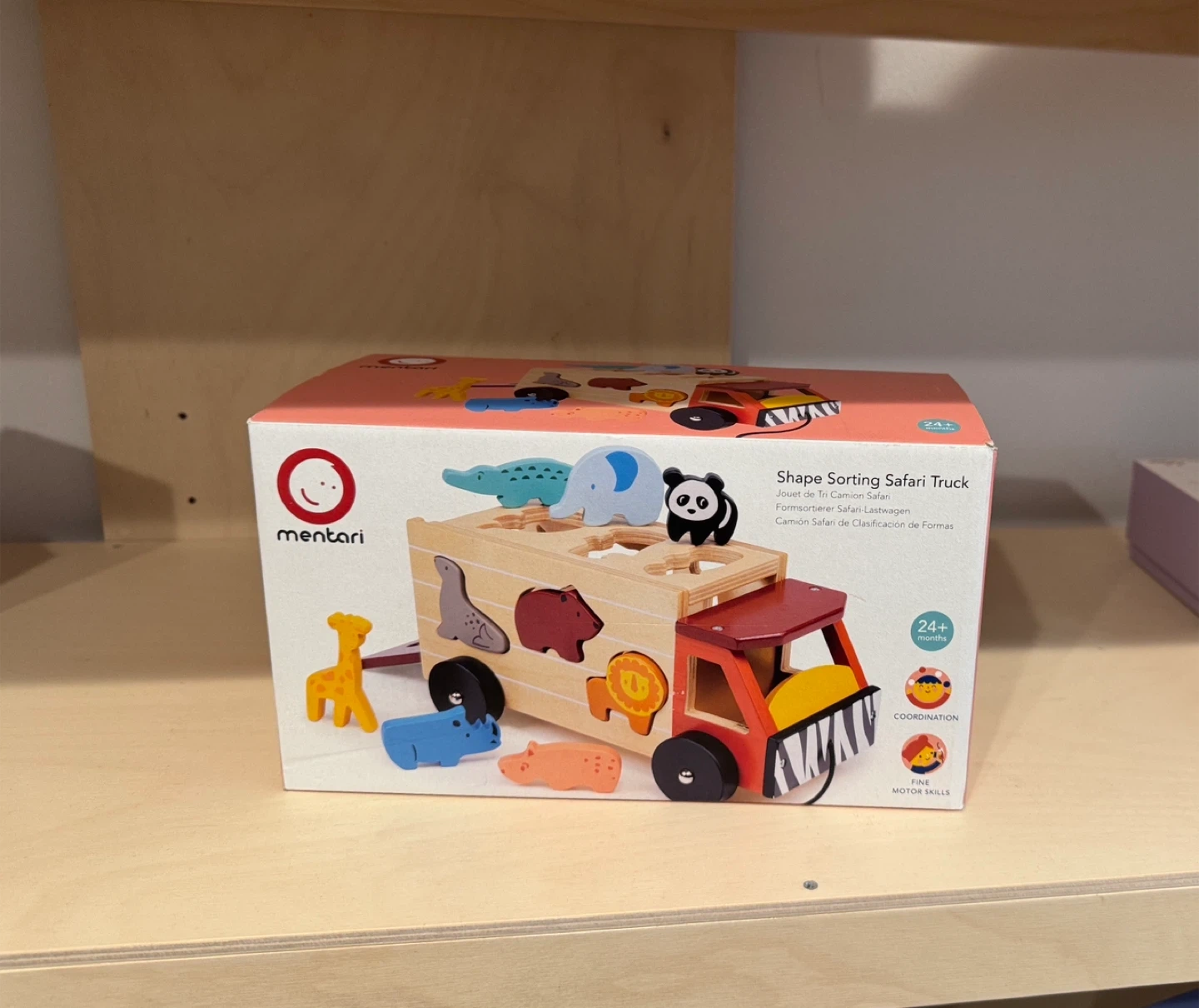 I have a brand new Mentari Shape Sorting Safari Truck for sale! It's still in its original box and ready for a new home. This toy is great for kids aged 24+ months and helps develop fine motor skills and coordination. It's made with sustainably sourced wood and features adorable animal shapes. The truck has four wheels and a drop-down door, and comes with shapes including a giraffe, a seal, a bear, a hippo, a panda, a crocodile, an elephant, a rhino and a lion
