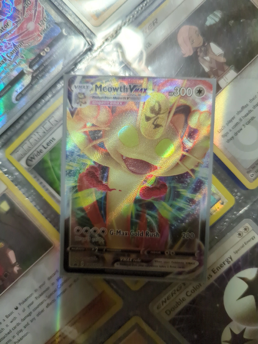 Selling a Meowth VMAX Pokemon card! It features the G-Max Gold Rush attack. A great addition to any collection!