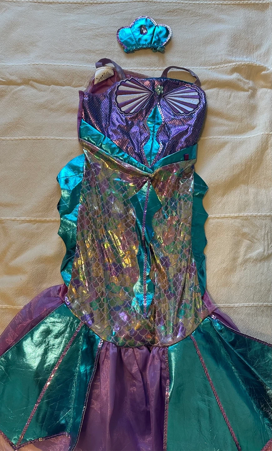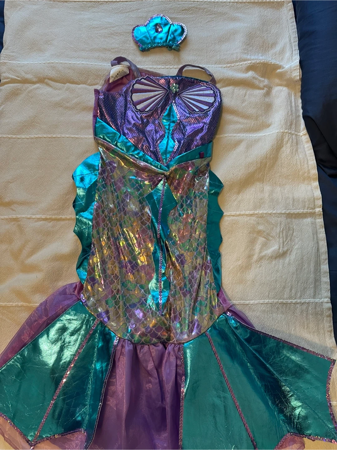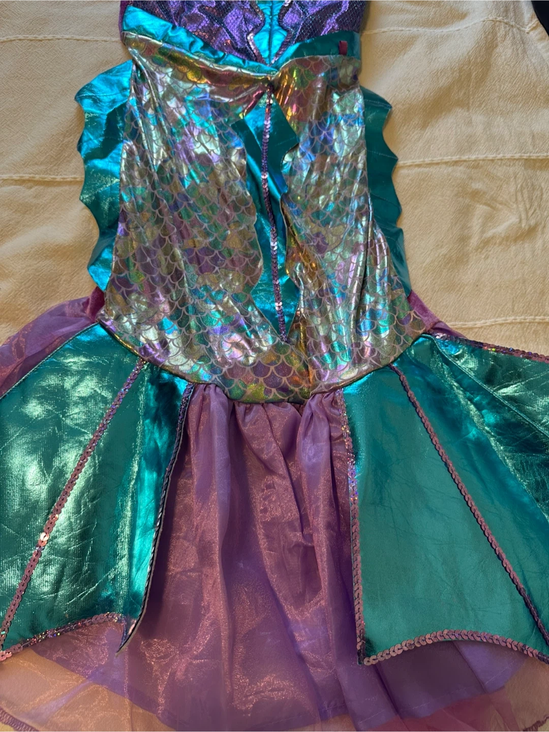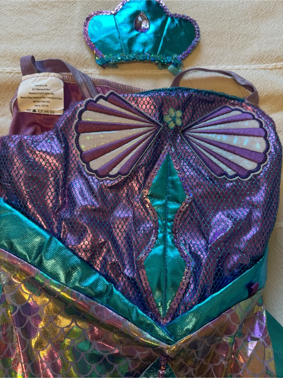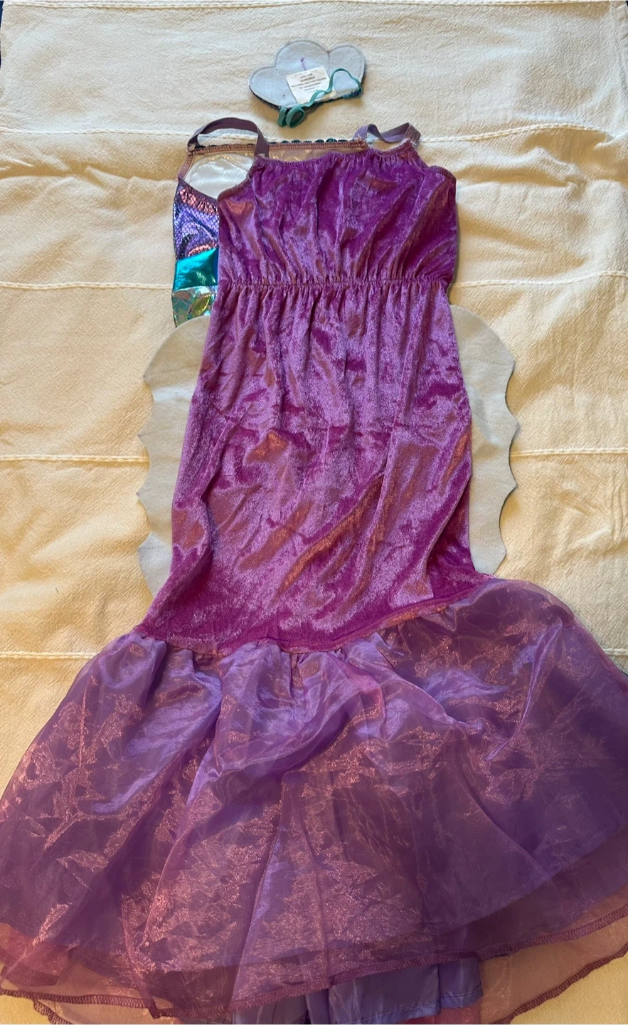 This adorable mermaid costume comes with a matching crown! It features beautiful iridescent and teal details, with a purple skirt and bodice. Perfect for dress-up or Halloween!