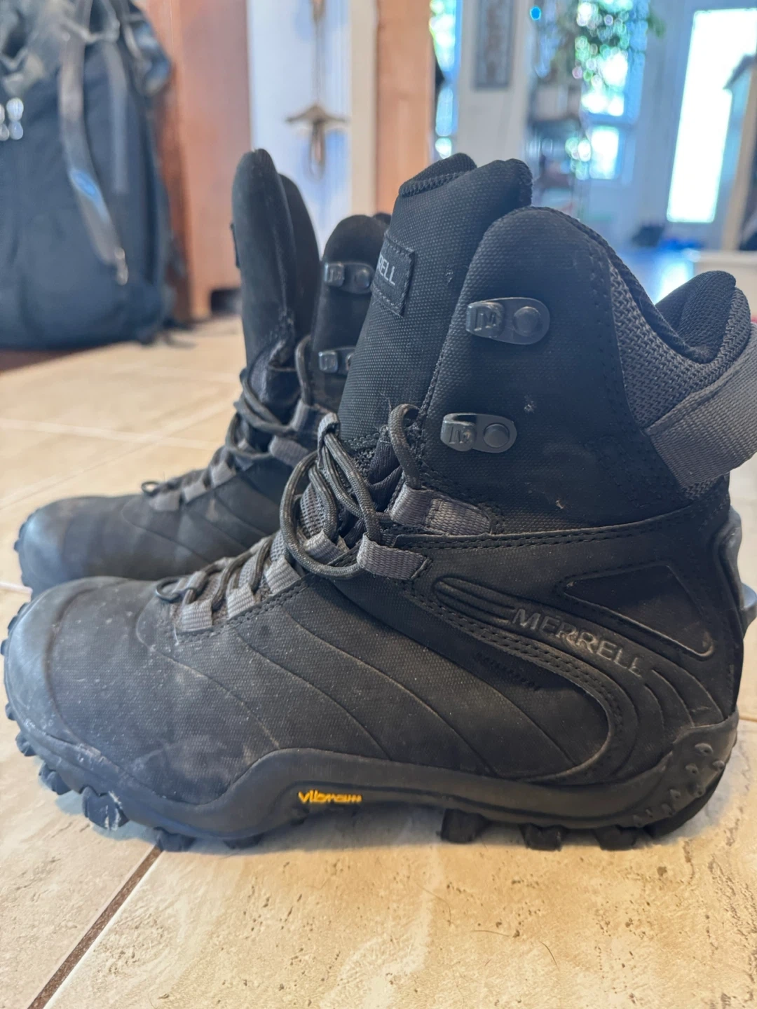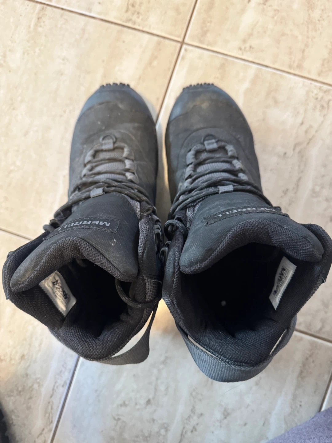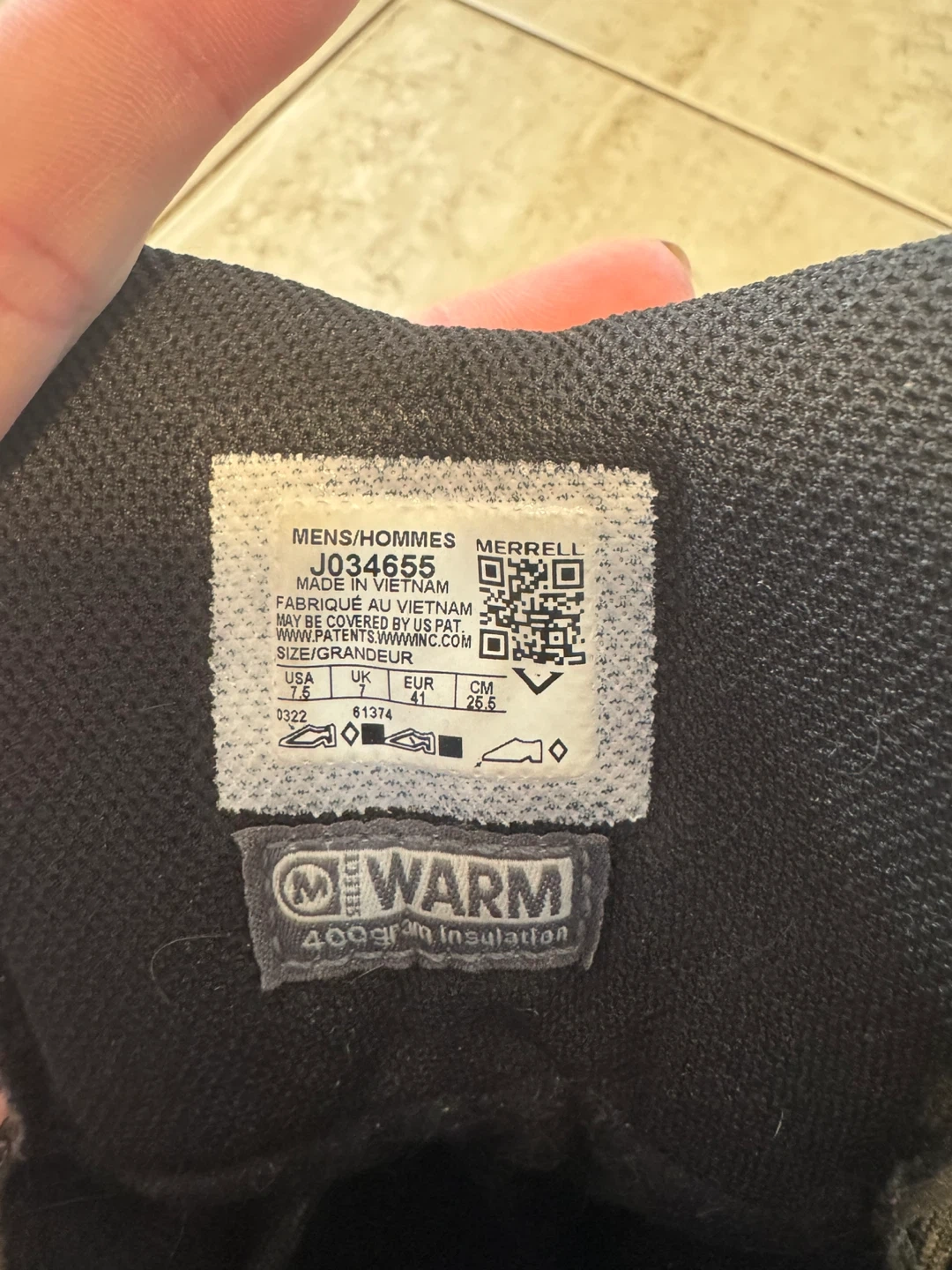 Selling a pair of Merrell men's hiking boots, model J034655, in a size 7.5 US. These boots feature 400g insulation to keep your feet warm and comfortable on those chilly hikes. They're made in Vietnam and ready for your next adventure!
