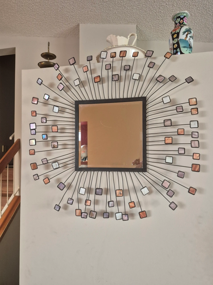 A decorative square mirror. Surrounded by metal lines and square tiles. The tiles are a mix of colours. Hang this mirror in your living room to create a relaxing and bright space.