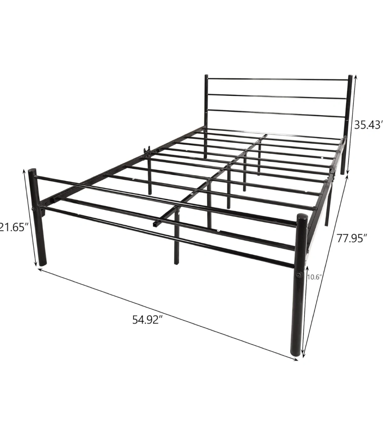 Selling a metal bed frame never used! It measures approximately 54.92 inches in width and 77.95 inches in length, with a height of about 35.43 inches. The bed frame is sturdy and ready for a new home