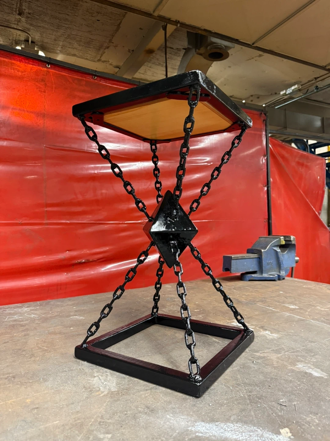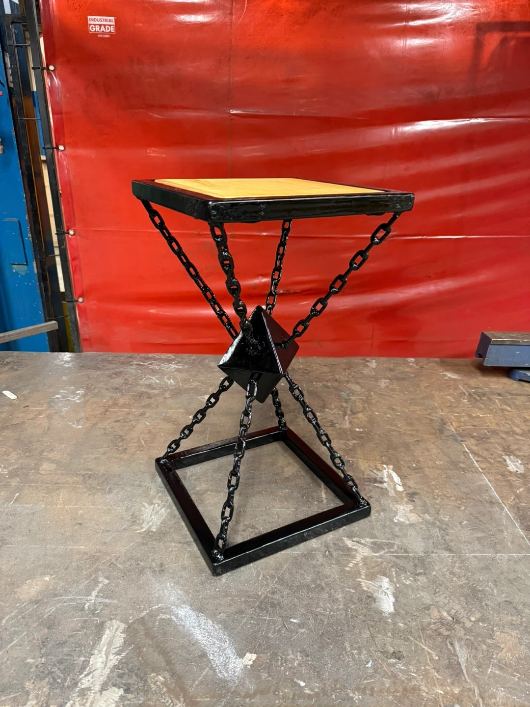 Unique accent table with a black metal chain design! This eye-catching piece would be a great addition to any room. It's sturdy and in great condition, ready to add some industrial flair to your space