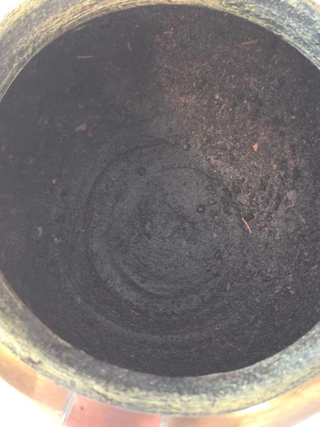 This is a used metal decorative pot with brass and copper accents, perfect for adding a touch of rustic charm to any space. It's in fair condition and ready to be a unique addition to your decor. Astounding patina. It's more than just a pot, it's a conversation starter!