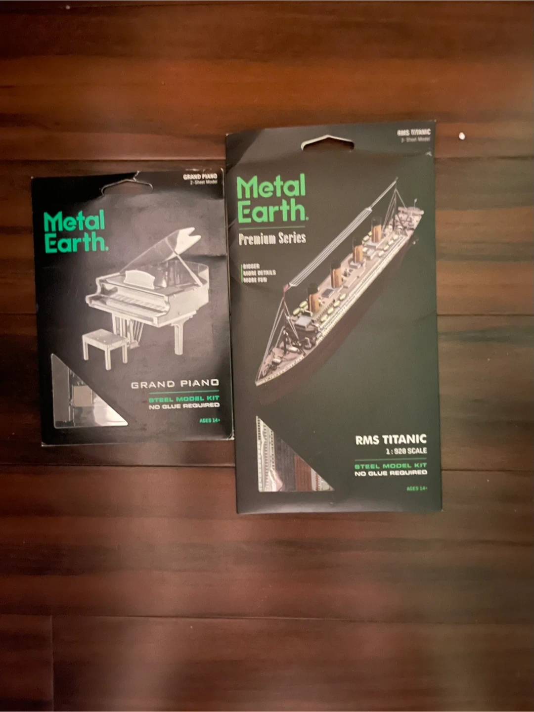 Selling two Metal Earth model kits: a Grand Piano and the RMS Titanic! Both are steel model kits and require no glue. Recommended for ages 14+.