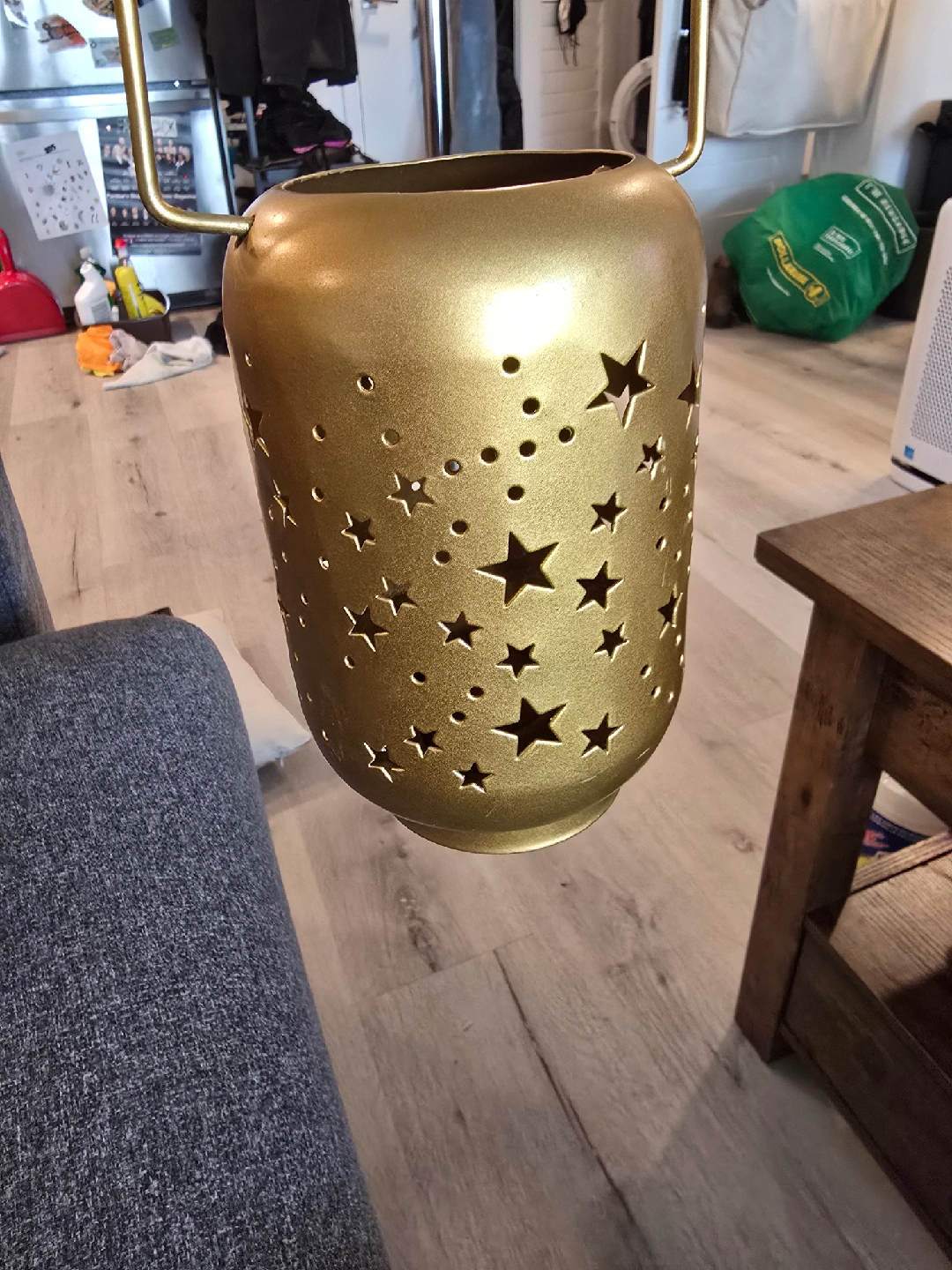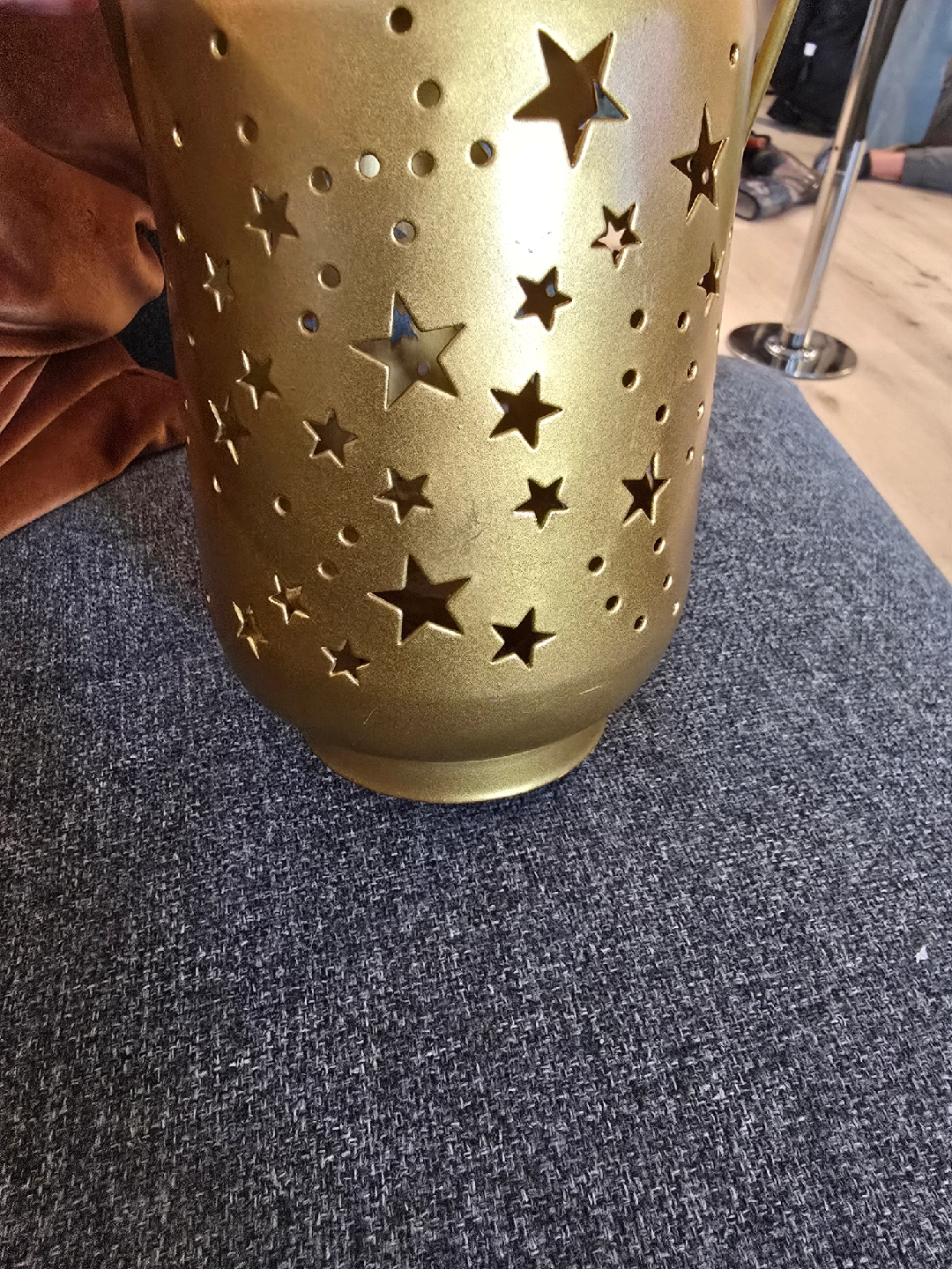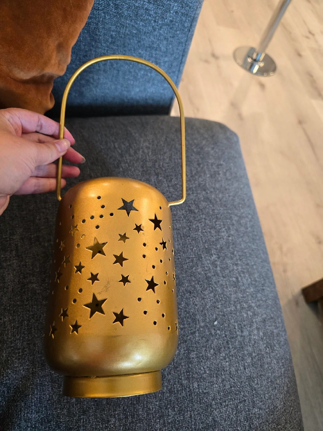 Selling a metal gold star lantern! It has a handle for easy carrying or hanging. The lantern has star and circle cutouts that create a lovely light pattern. Perfect for adding a touch of whimsy to any room, cozy fall vibes or cute halloween night skies! bottom screws out for easy candle removal. could use a little clean but otherwise in great condition!
