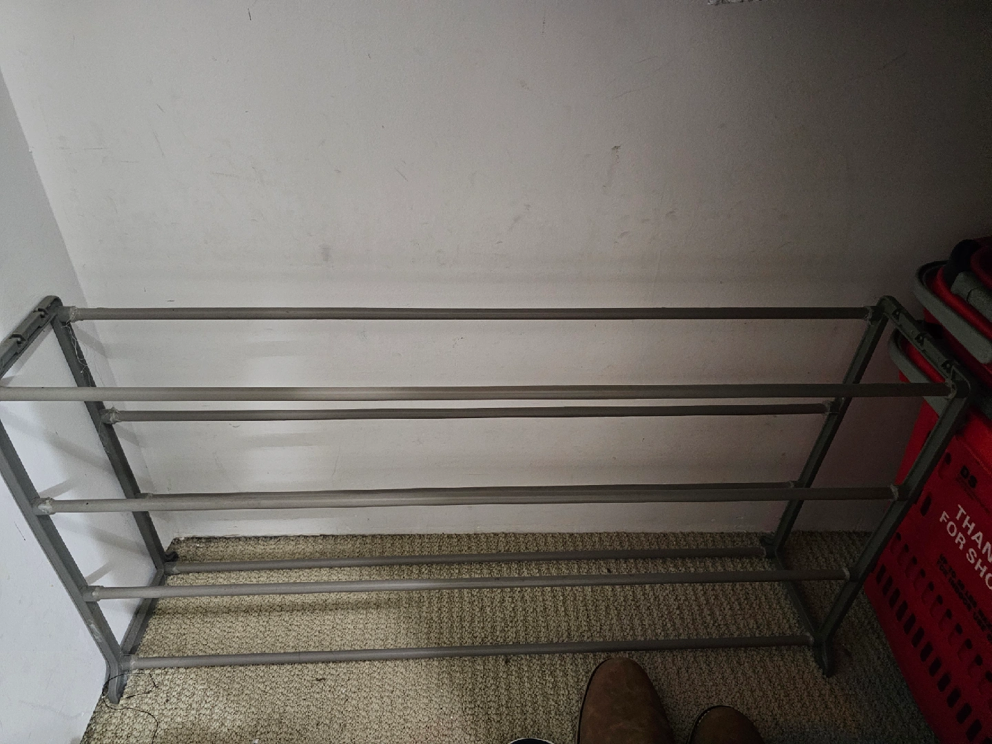 Here's a metal shoe rack, perfect for keeping your entryway organized! It's in great shape and ready to use