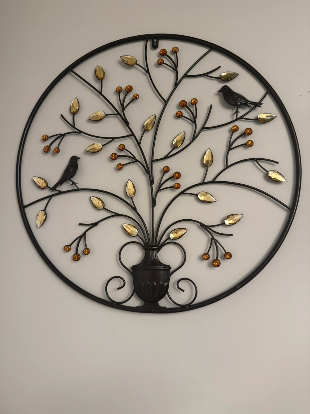 Add a touch of nature to your home with this beautiful metal tree wall decor! It features a circular frame with a stylized tree design, complete with birds, leaves, and amber coloured accents. It's in great condition and ready to hang to bring a bit of charm to any room