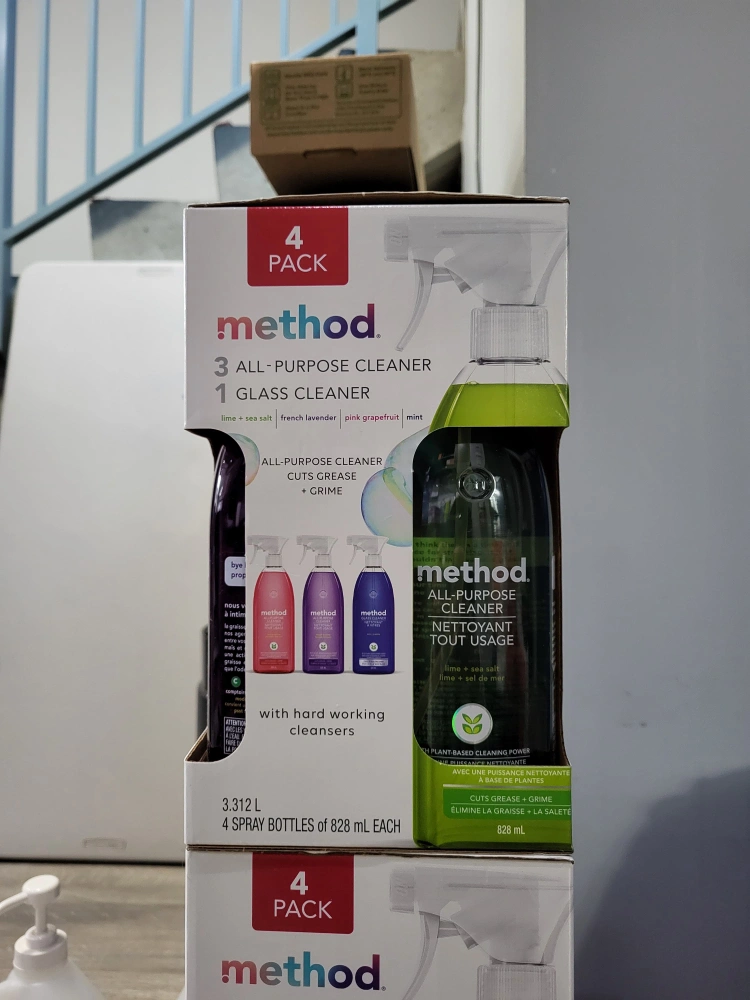 Selling a 4-pack of Method all-purpose cleaner! Includes 3 all-purpose cleaners and 1 glass cleaner. The all-purpose cleaners cut grease and grime, and the scents included are lime + sea salt, french lavender, and pink grapefruit. Each spray bottle contains 828 mL, for a total of 3.312 L. 📍Pickup only at 235 East Georgia Street, Vancouver, BC, V6A 1Z6 🗓 Available during Weekdays only. (9 AM to 3 PM) 💰Cash payment only please.