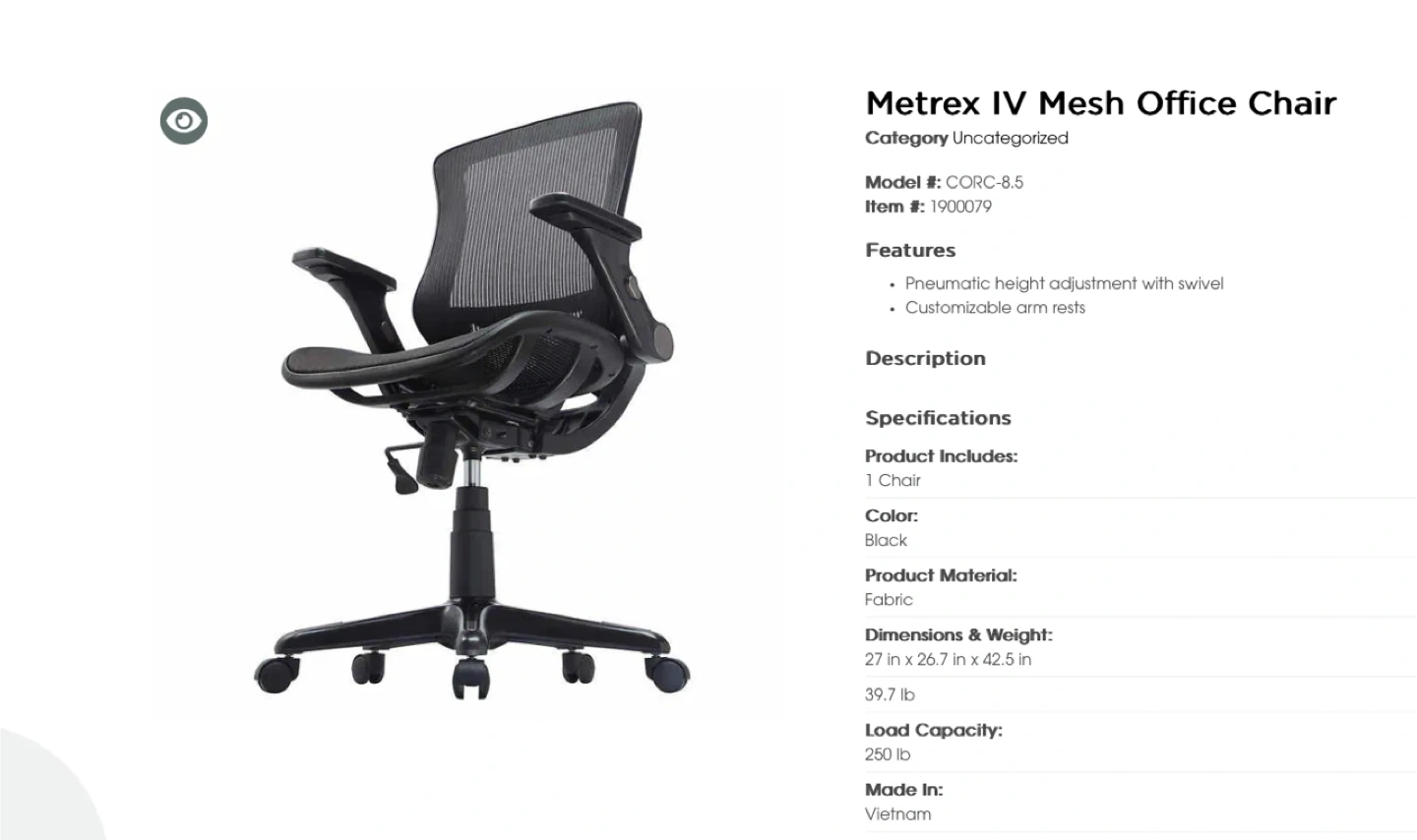Looking to sell my Metrex IV Mesh Office Chair! It's in great shape and super comfy for long work sessions. It features: - Pneumatic height adjustment with swivel - Customizable arm rests - Vented mesh for comfort - Fully adjustable armrests - Stable 5-star base The chair's dimensions are 27 in x 26.7 in x 42.5 in and has a load capacity of 250 lb used 2 months only.