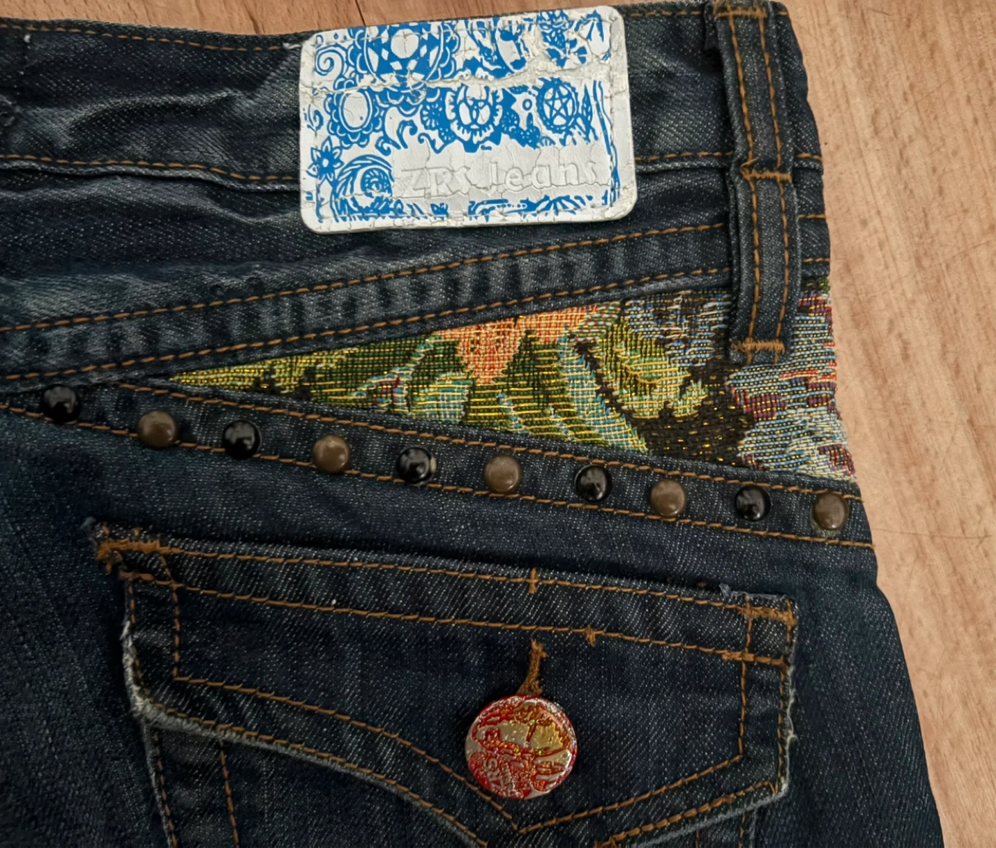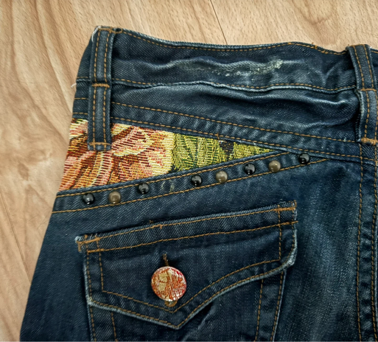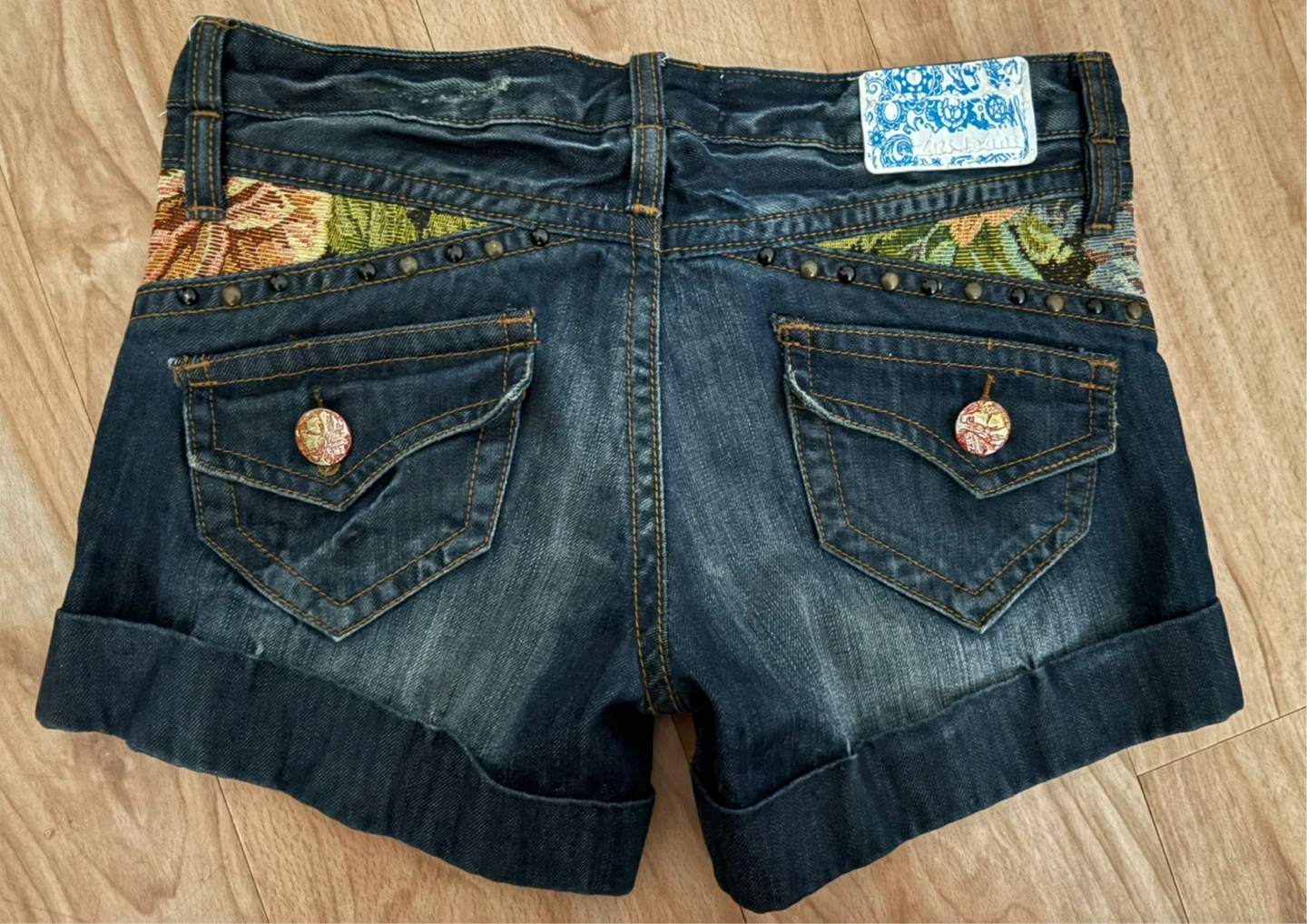 Cute Metter Correct denim shorts with unique floral tapestry and studded detailing!