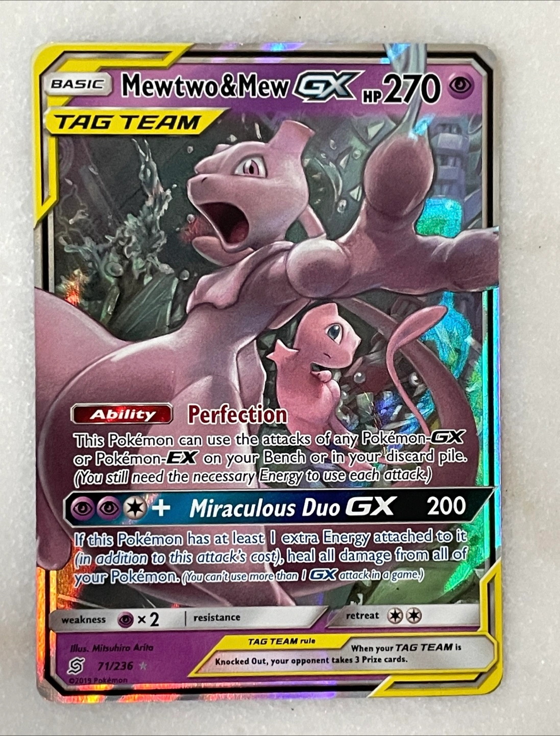 Selling a Mewtwo & Mew GX Tag Team Pokemon card. It's in great shape and ready for a new home! This card has the ability 'Perfection' and the attack 'Miraculous Duo GX'. Add this awesome card to your collection