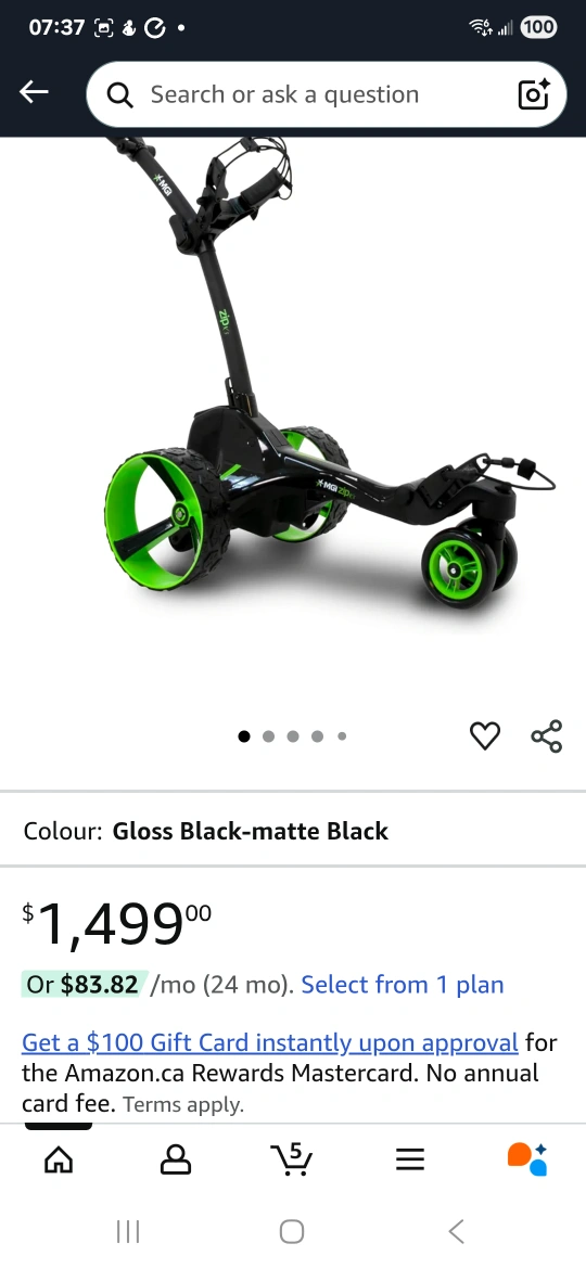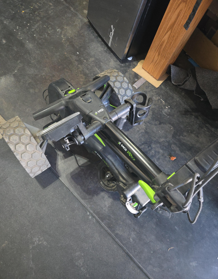 Selling an MGI Zip X5 electric golf caddy in gloss black and matte black with green accents. Comes with scorecard and umbrella holders used sparingly. 17 km on the battery, folds for transport, comes with charger