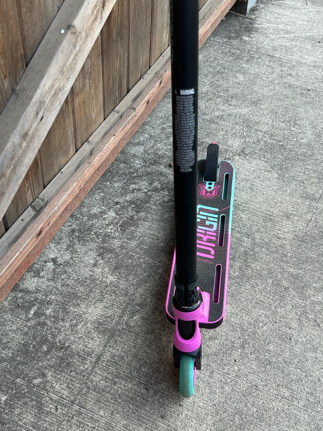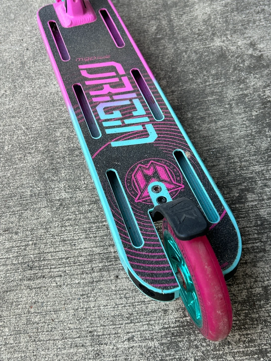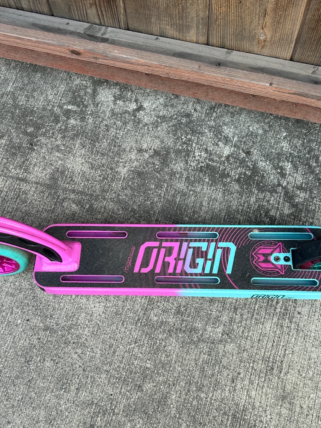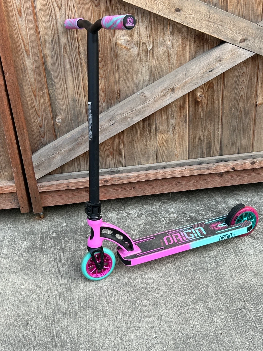 Selling a MGP Origin Team Edition scooter in a cool pink and teal colour combo! It's in good used condition and ready for some fun rides around the neighbourhood. The scooter features the MGP Origin logo on the deck. Perfect for kids or teens looking for a stylish and reliable ride