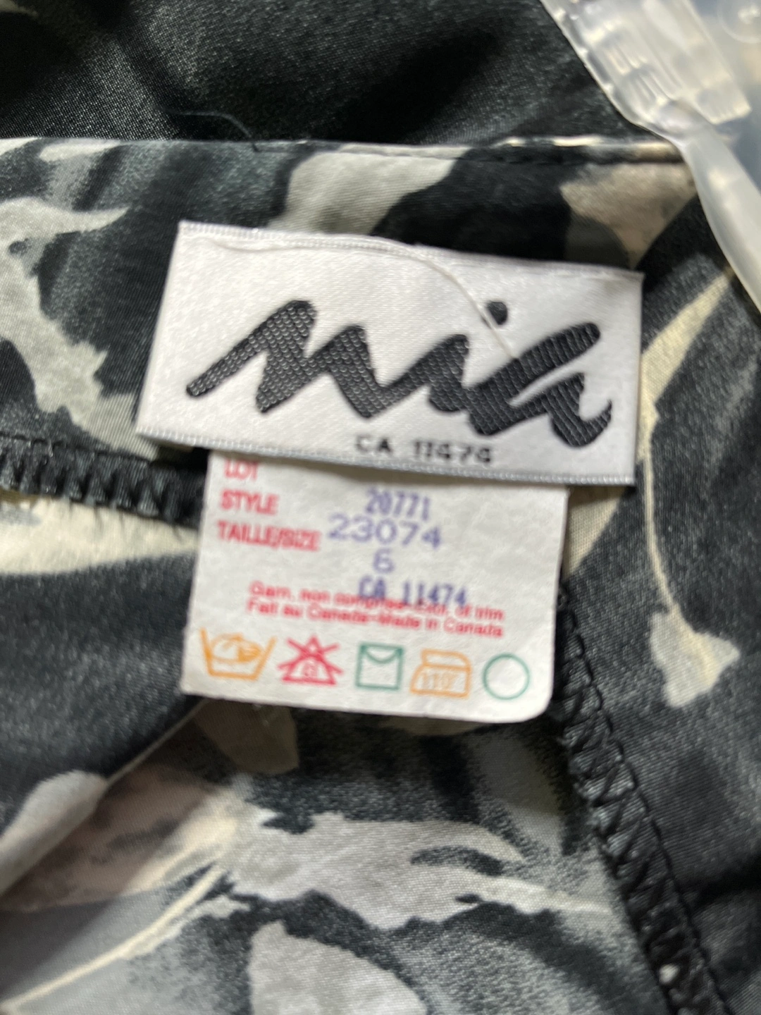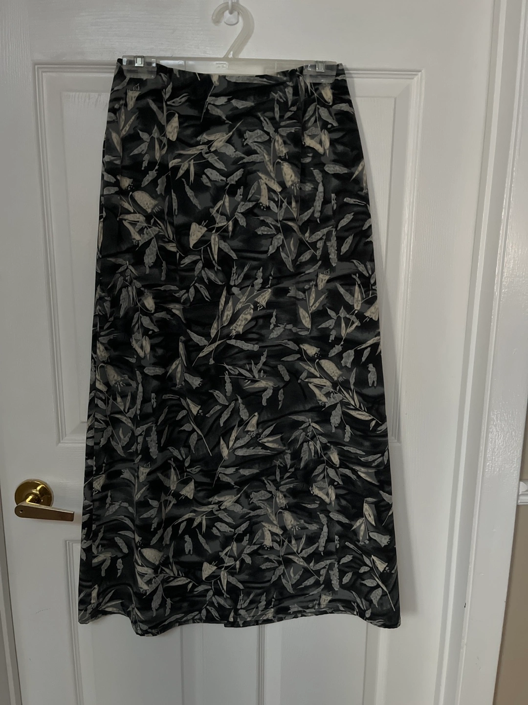 Black & Grey A-Line full length skirt with a white floral print. Made in Canada. Length is 35”