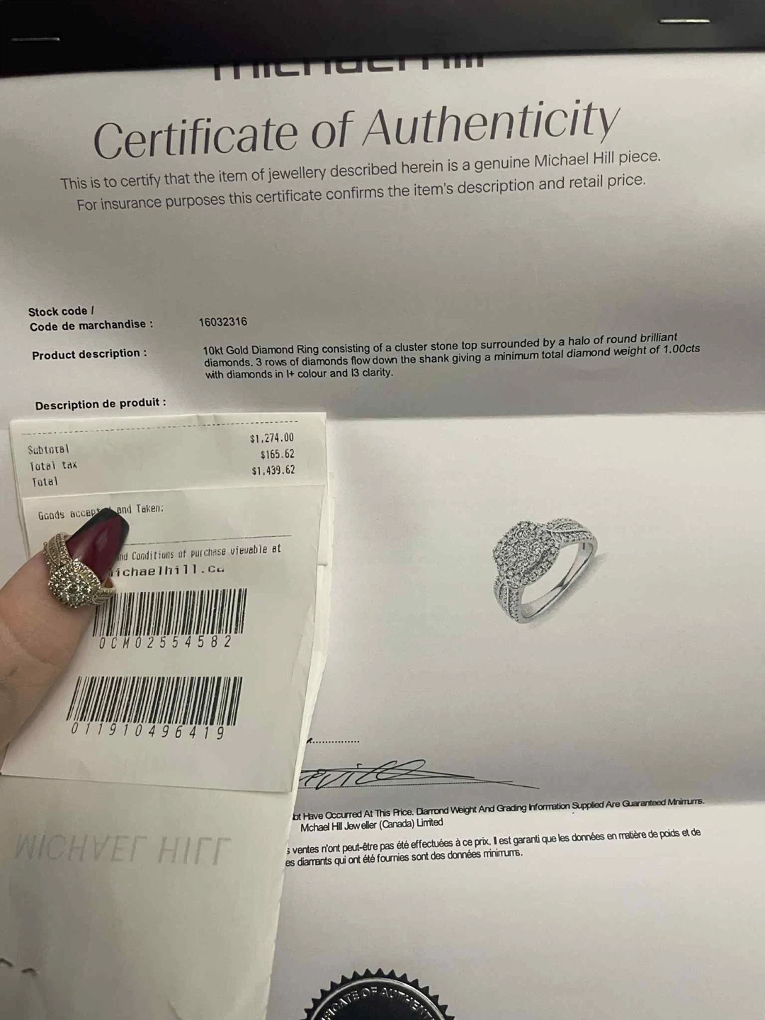 ITEM CANT BE SHIPPED, IT IS IN PERSON PICK UP!!! SERIOUS INQUIRIES ONLY! Selling a beautiful 10kt gold diamond ring from Michael Hill! The ring features a cluster stone top surrounded by a halo of round brilliant diamonds. It has 3 rows of diamonds down the shank, giving a minimum total diamond weight of 1.00cts with diamonds in I colour and I3 clarity. A stunning piece!
