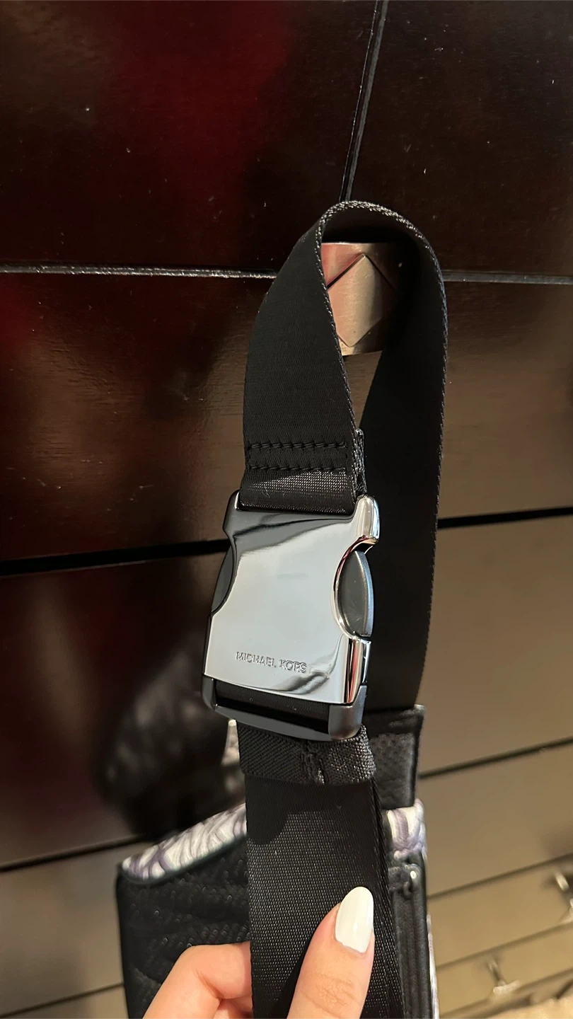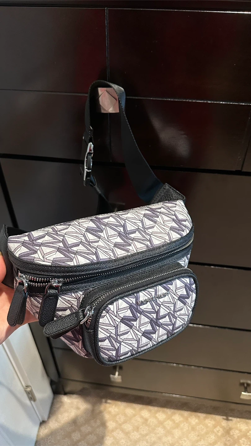 Selling a gently used Michael Kors belt bag. It features a stylish geometric pattern in shades of black, white, and grey. The bag has multiple zippered compartments and an adjustable black strap. The interior lining is black with the MK logo. A great accessory for hands-free convenience! Never used.