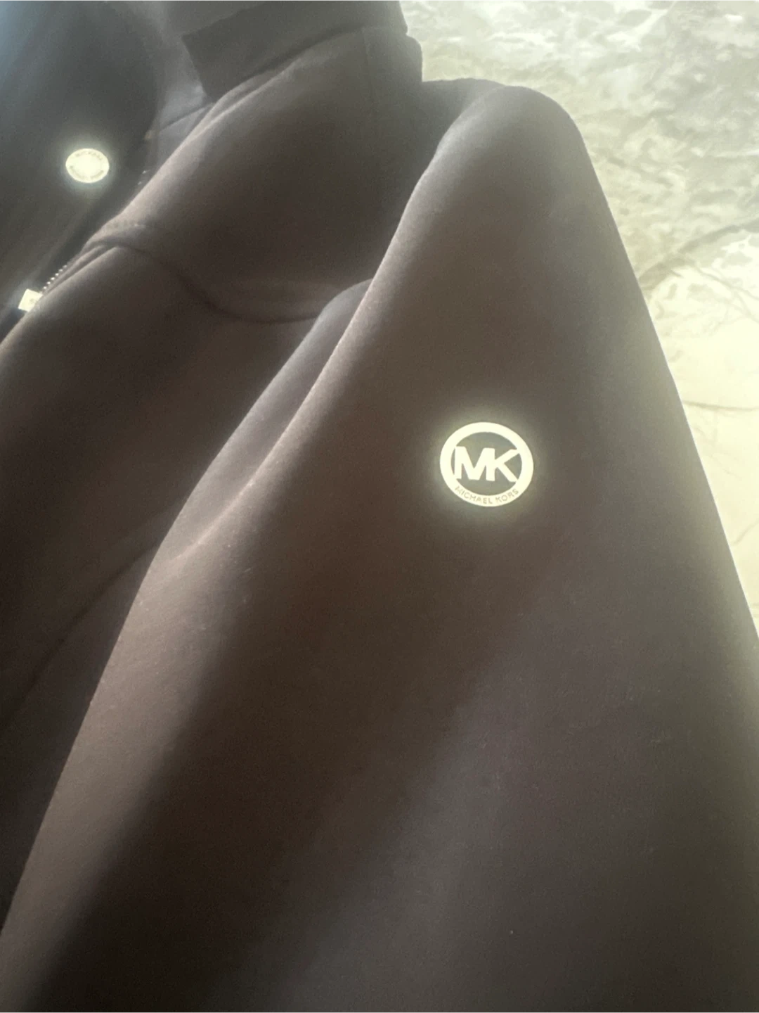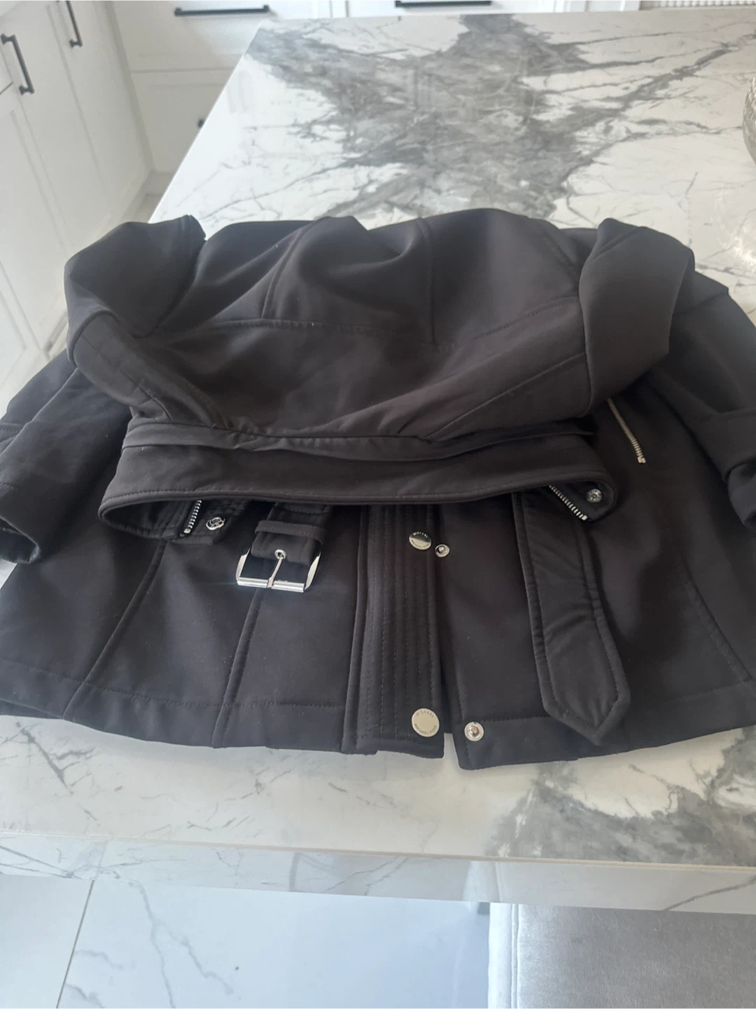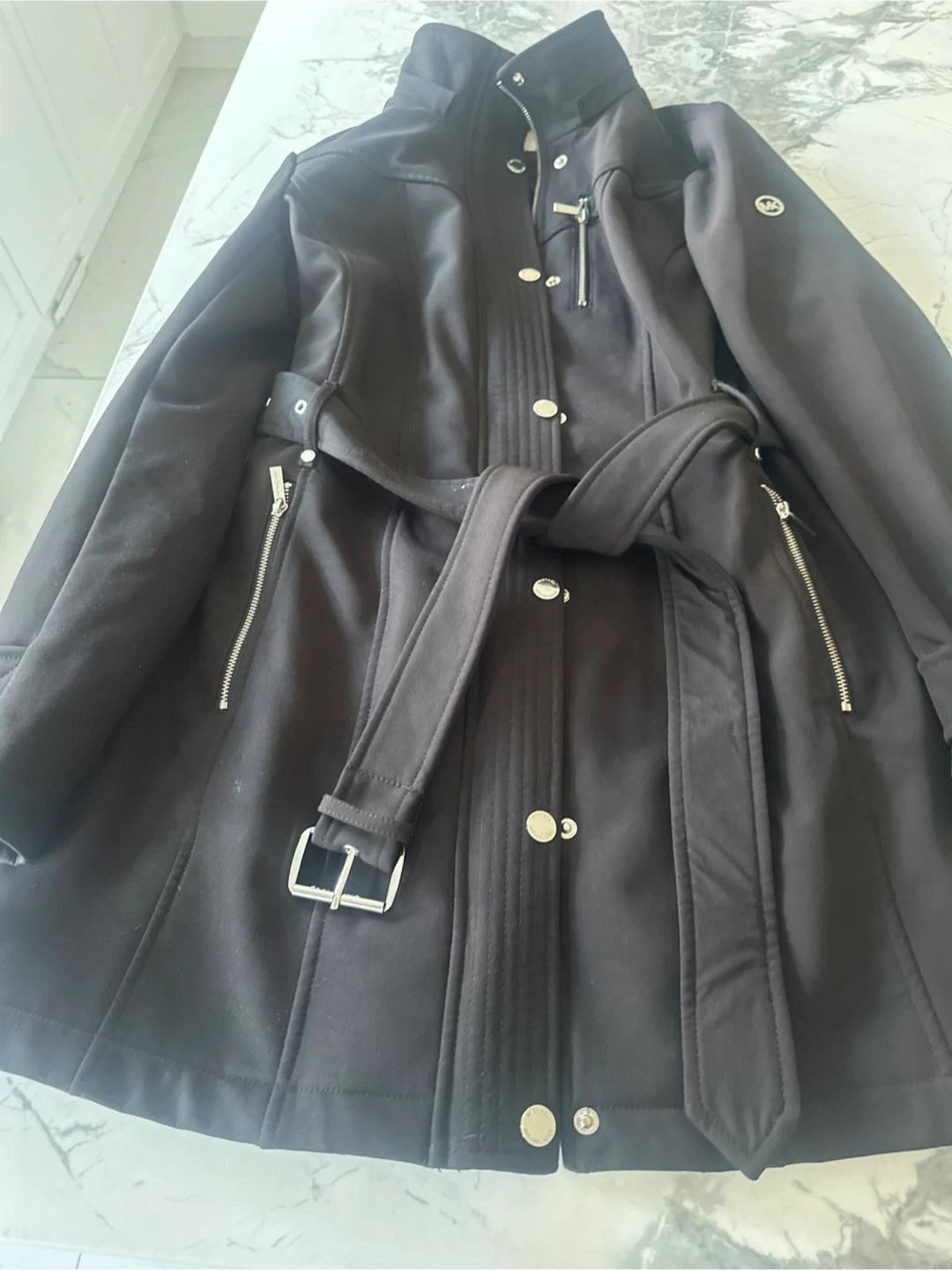 Selling a stylish black belted coat from Michael Kors! It's in great condition and features a sleek design with multiple zippers and button details. Perfect for adding a touch of sophistication to your wardrobe!