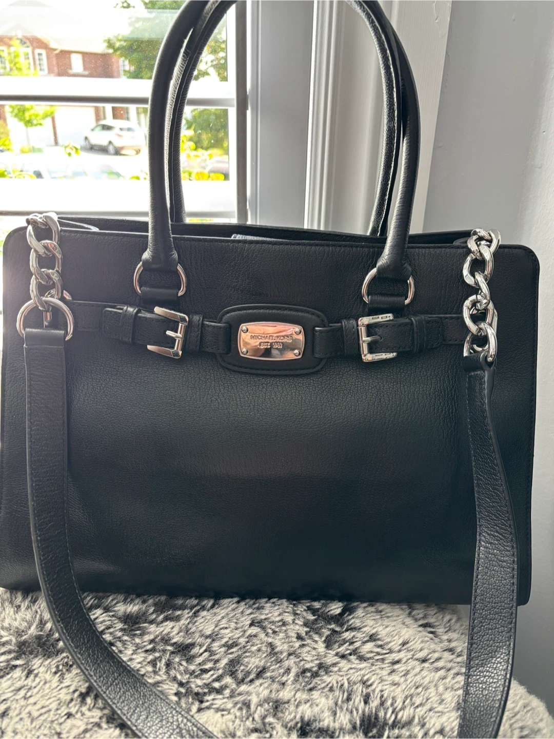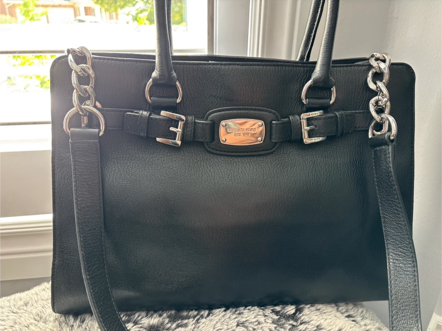 Selling a stylish Michael Kors tote bag in black leather! It features silver-tone hardware, including chain detailing and buckle accents. Perfect for carrying your essentials in style! Can meetup Port Perry Oshawa Markham