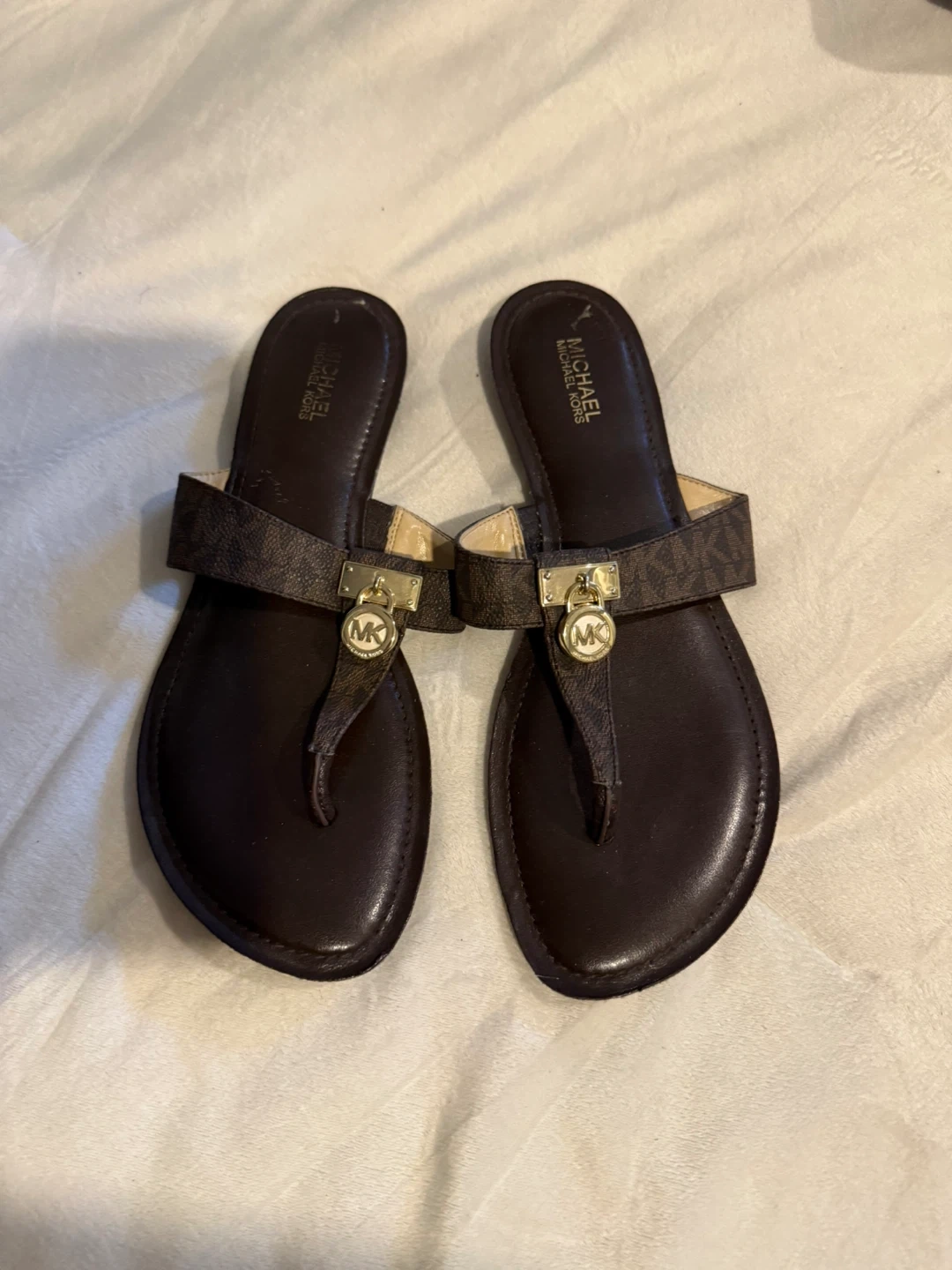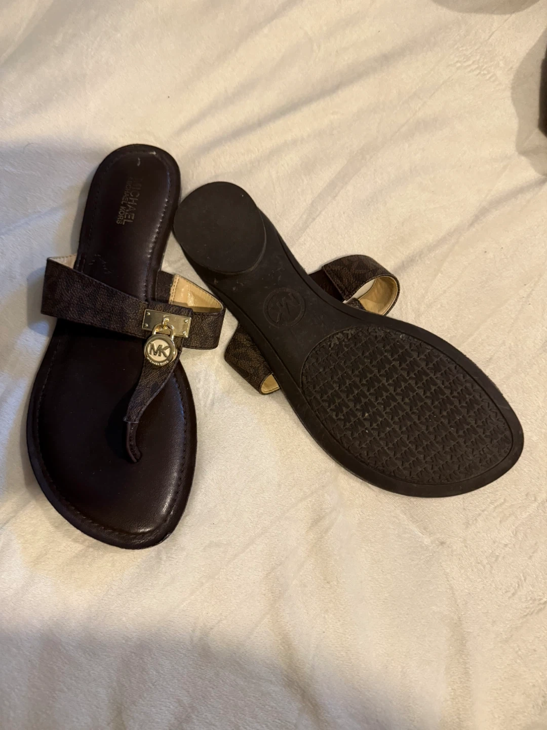 These are a pair of Michael Kors flip flops in brown. They feature the MK logo. Perfect for summer!