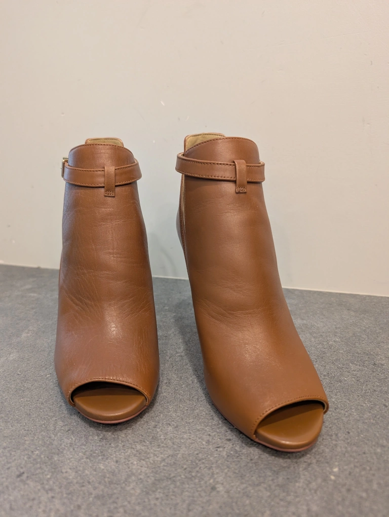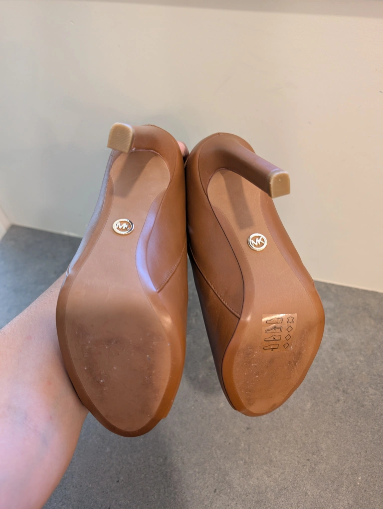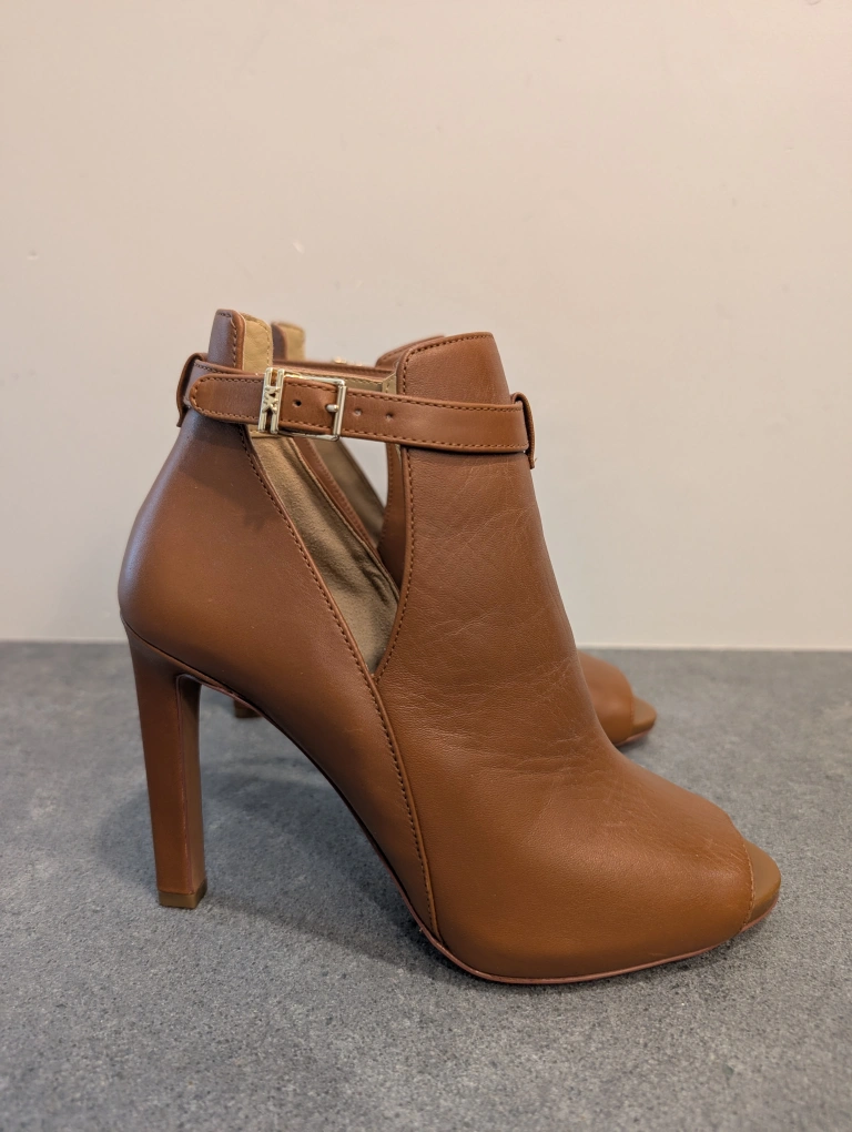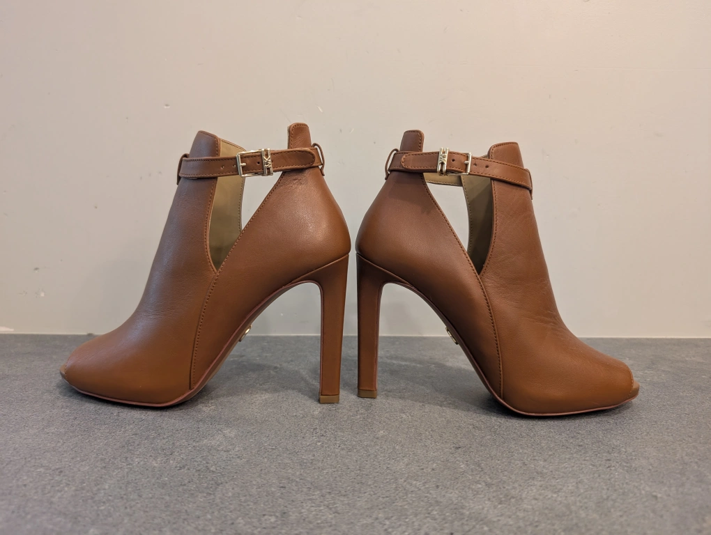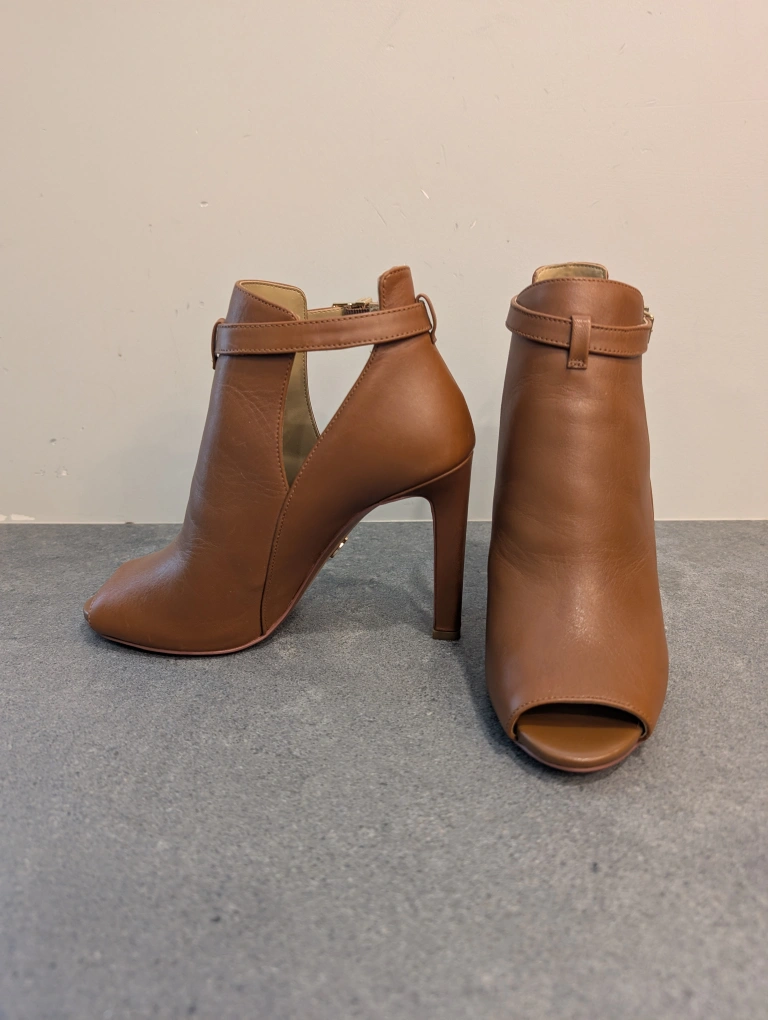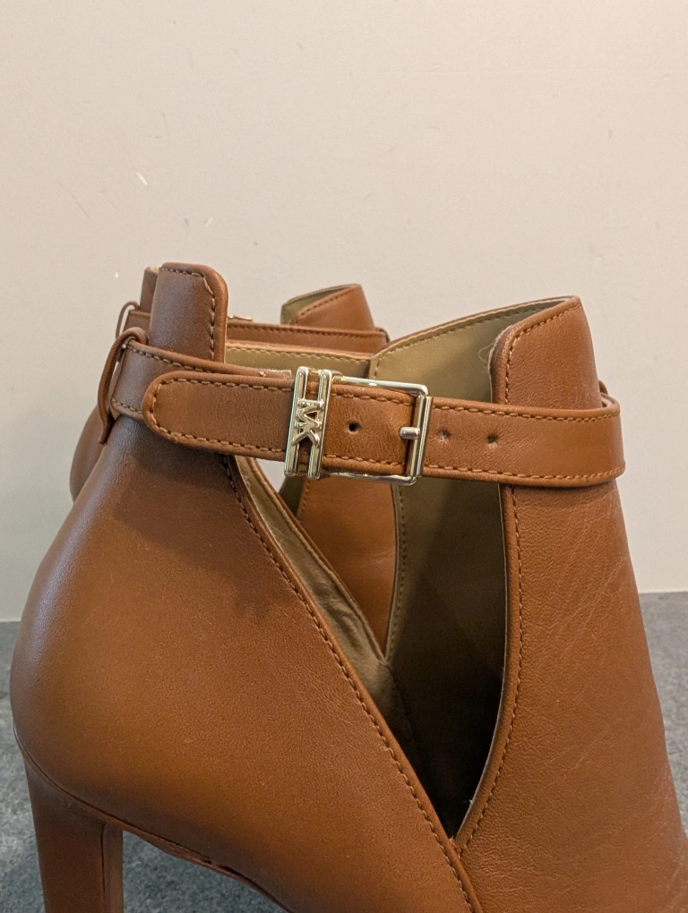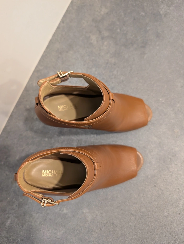 These are a pair of Michael Kors heels in a lovely brown leather. They feature an open-toe design and a stylish ankle strap. Perfect for dressing up any outfit! only worn once! size 7