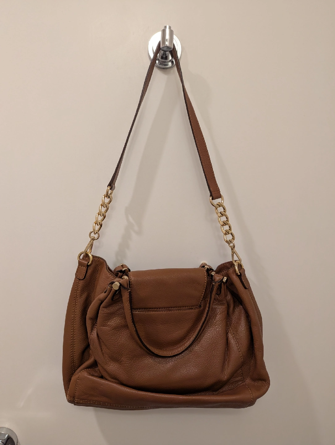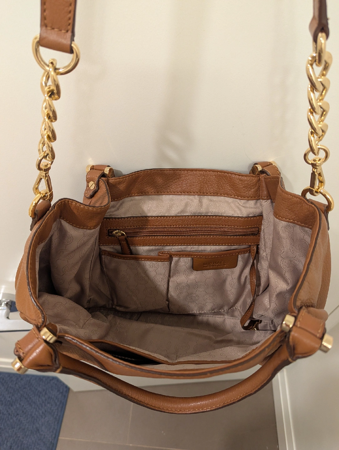 Michael Kors shoulder bag in a lovely brown leather. It features gold chain detailing on the straps and the classic MK logo. Perfect for everyday use or a night out.