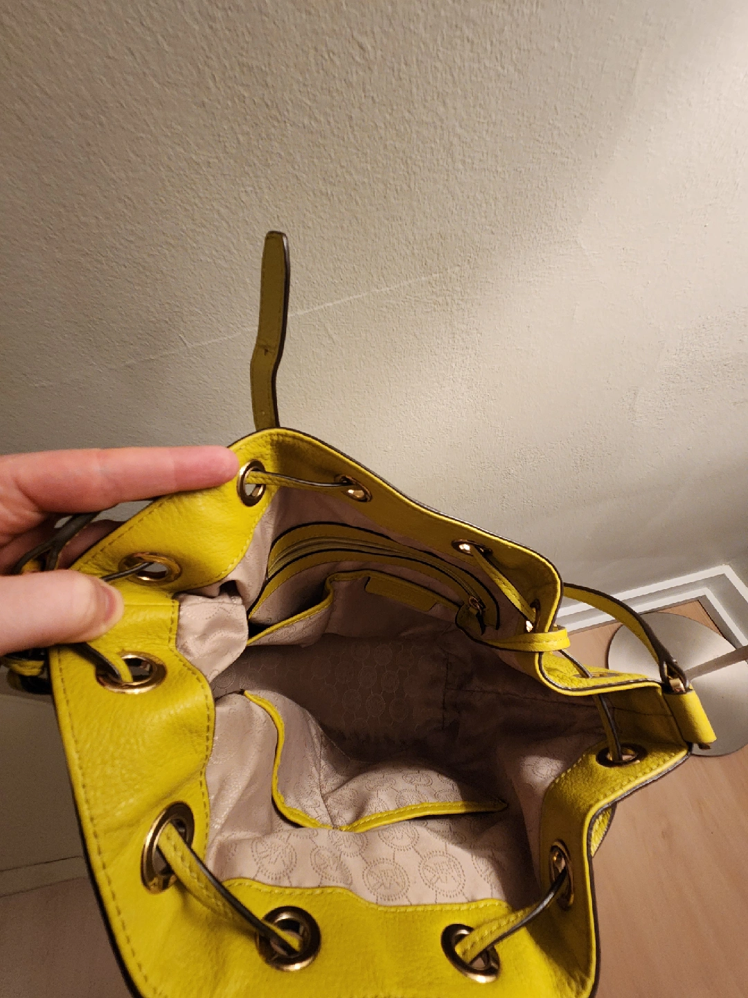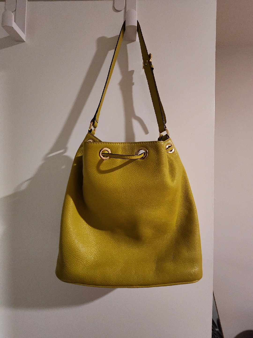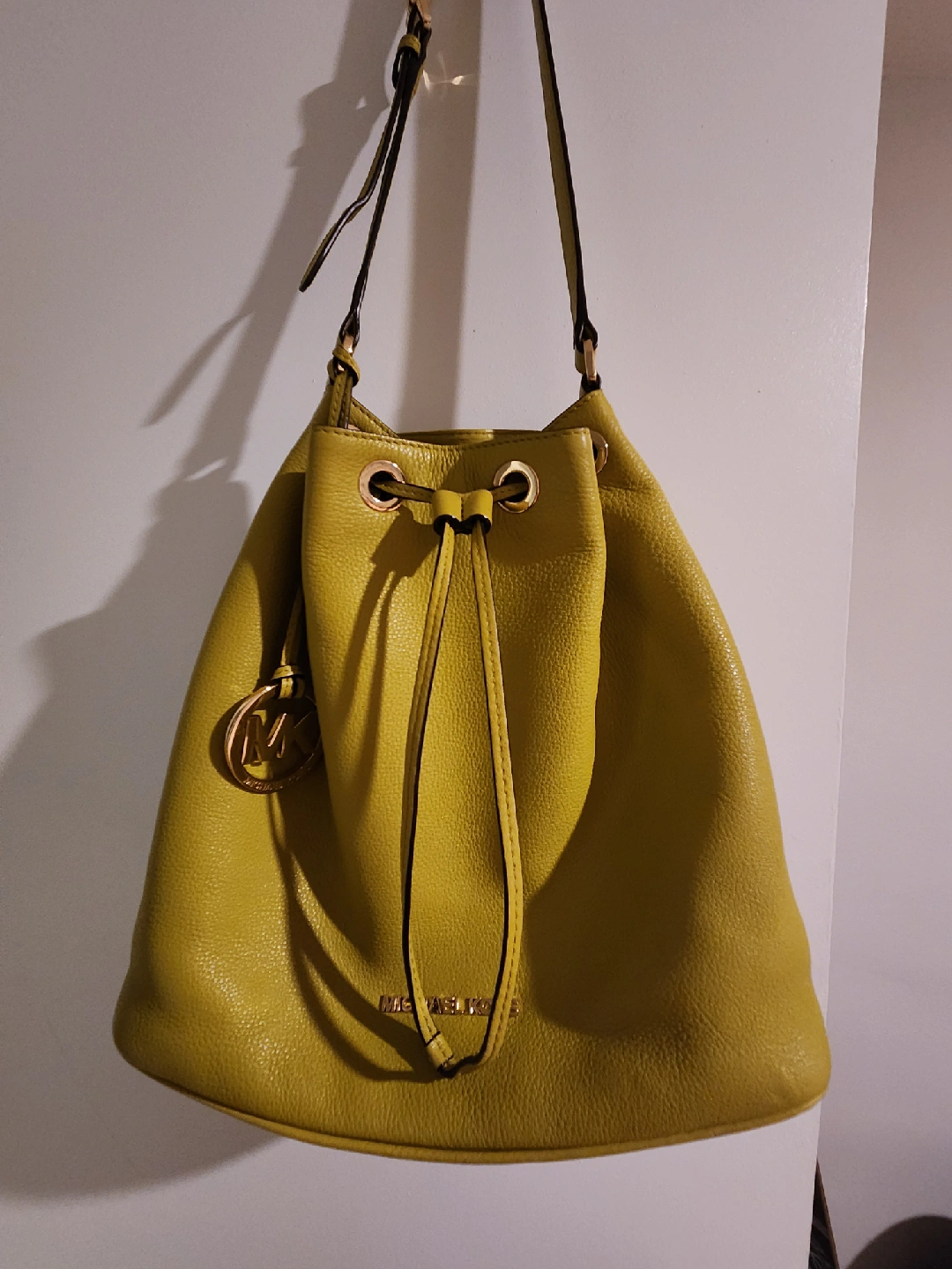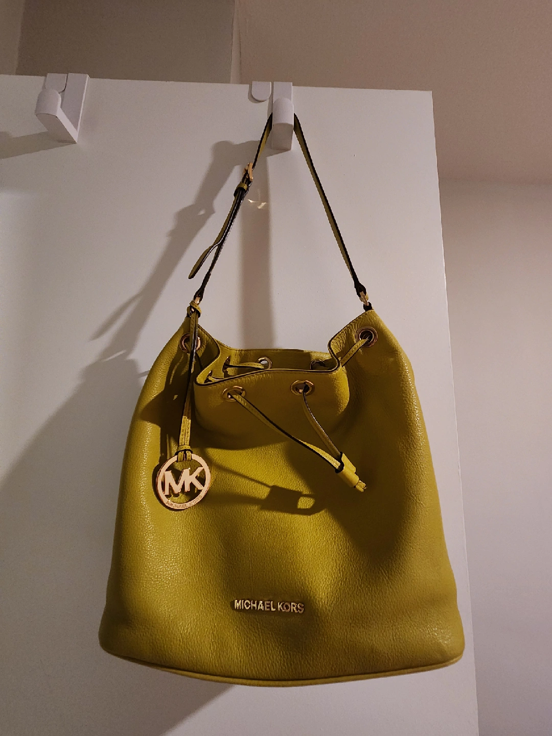 Selling a lovely Michael Kors bucket bag in lime green! Comes with MK accessory still attached. Features a cinch closure, an adjustable shoulder strap and a flat satchel design. Perfect for everyday use, rest your bag without fear the contents will spill over..or have fun curating your new look for a night out! We all know it's what the inside that counts, Michael Kors did not neglect skimp on storage space or storage options as pictured. The price is firm $80 for this lime green gem. It won't last long. Let me know if you can't live without it! ๐โจ