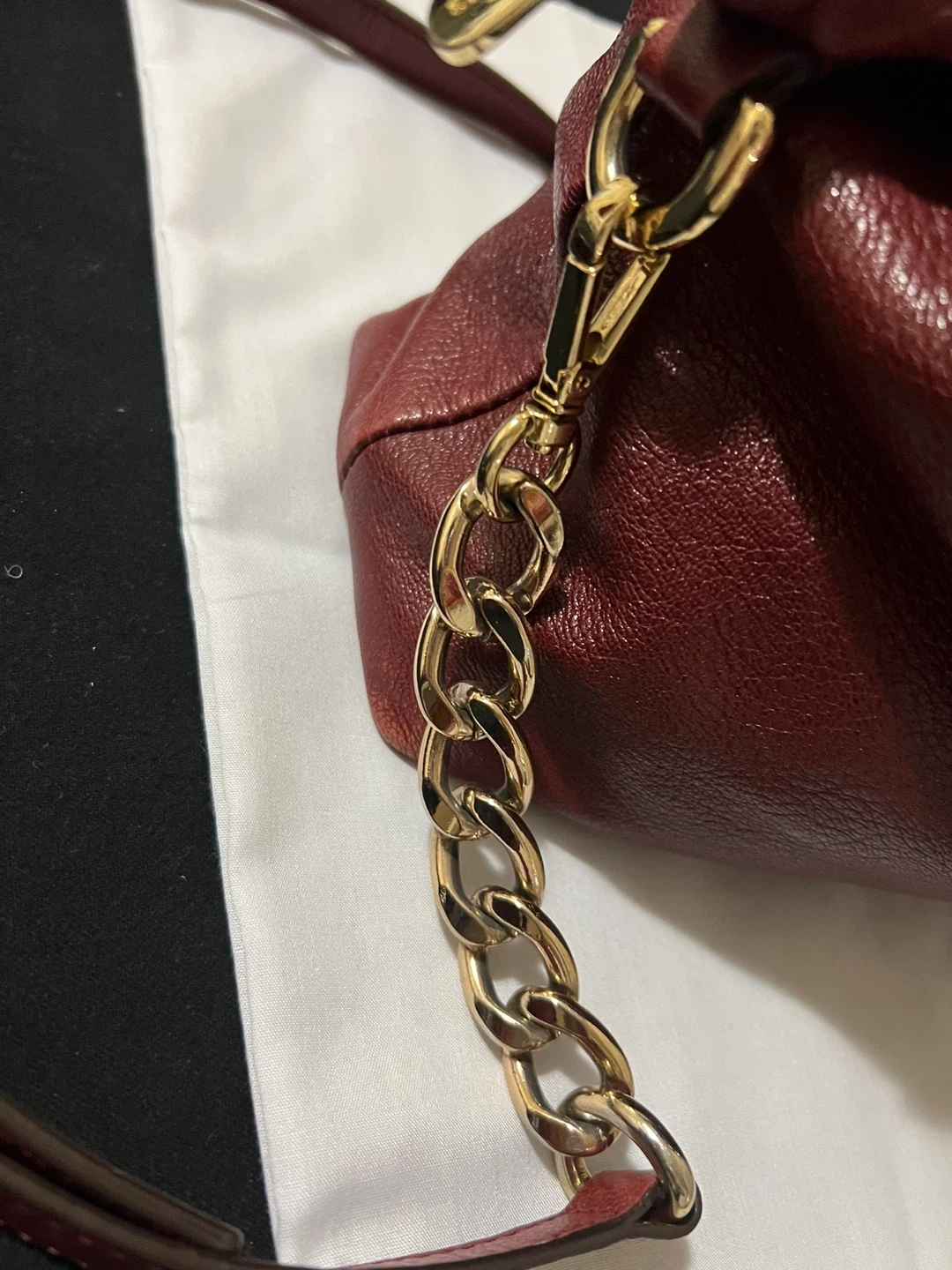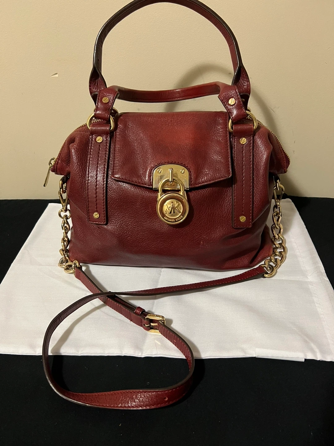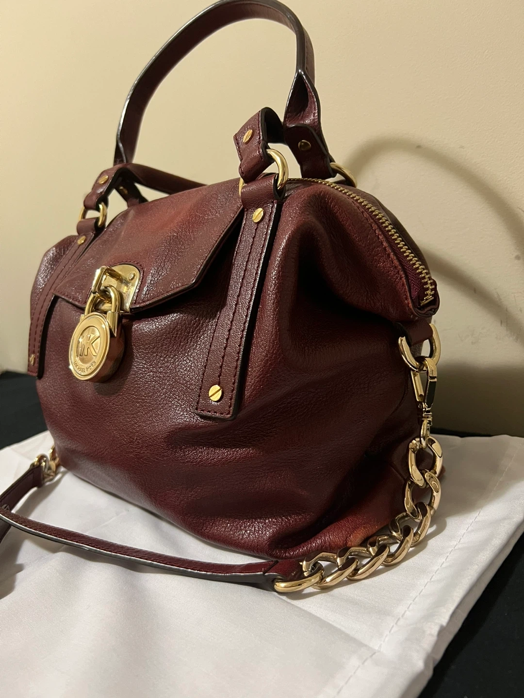 Selling a burgundy leather satchel from Michael Kors. It features a top handle, a detachable shoulder strap, and gold-tone hardware, including a decorative lock with the MK logo. The interior is lined and has multiple pockets. It's a stylish and practical bag for everyday use!