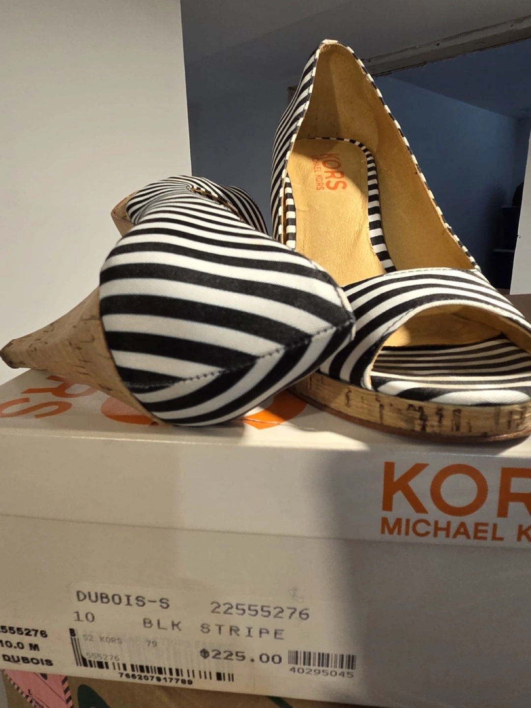Cute Michael Kors Dubois wedge sandals in a black and white stripe pattern! They are size 10 and come with the original box. The box indicates that these originally retailed for $225