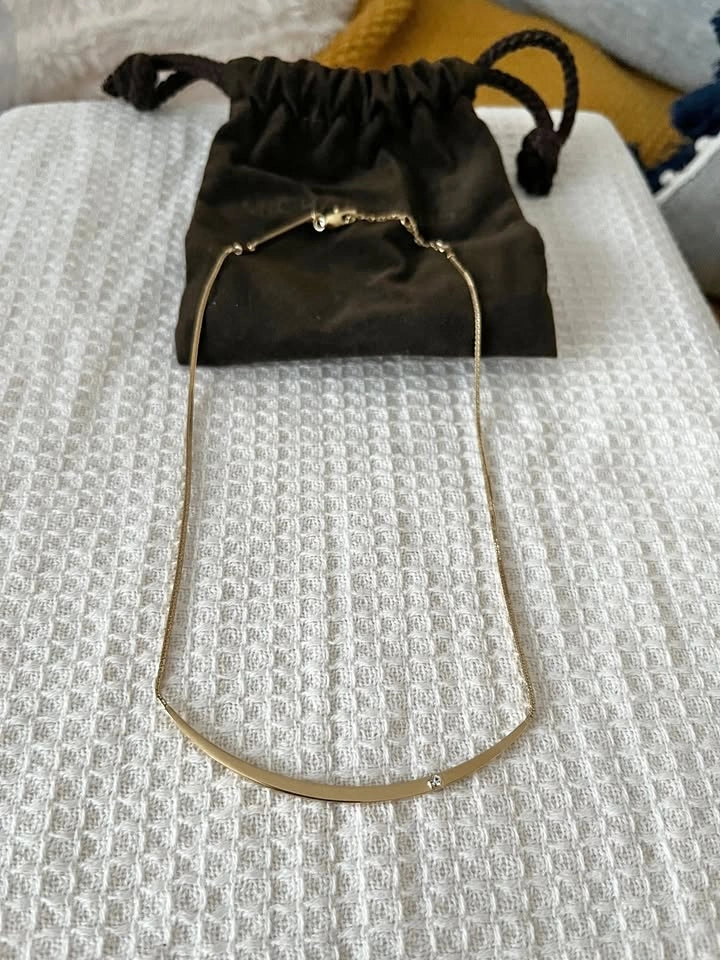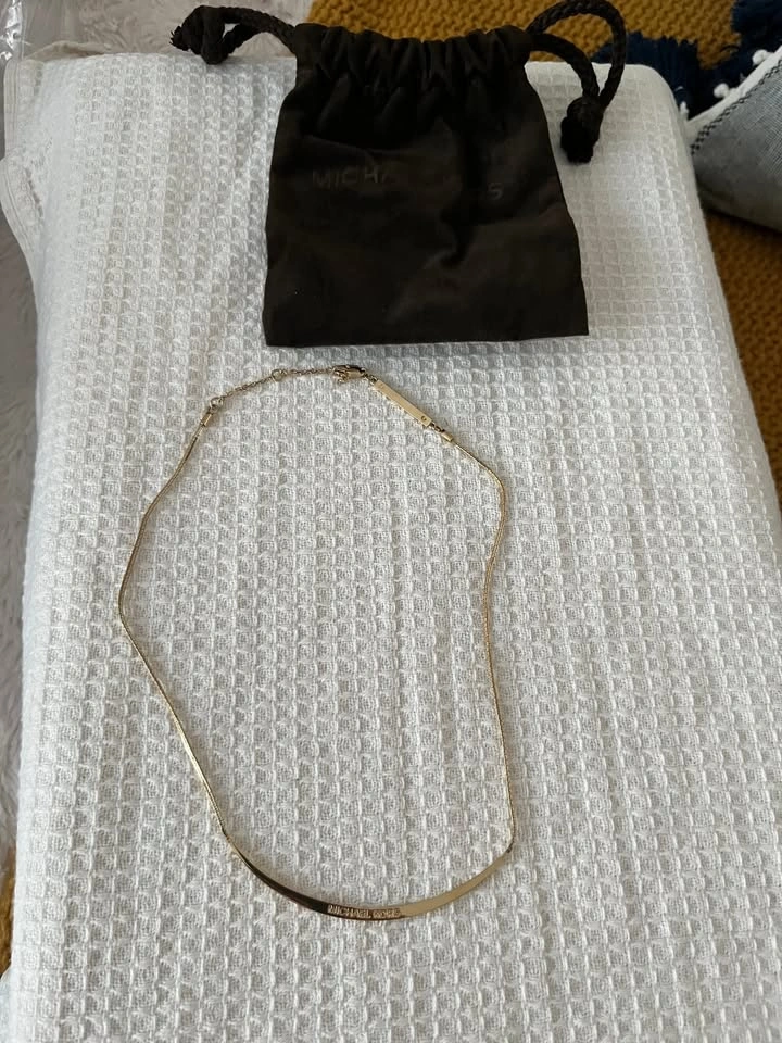For sale is a pre-owned, authentic Michael Kors necklace. This piece features a delicate gold-toned chain with a curved, polished bar pendant. The bar is engraved "MICHAEL KORS" and has a small, clear cubic zirconia stone on one end. Condition: Excellent, pre-owned condition. The necklace has been worn only a few times and is very well-maintained. Authenticity: 100% genuine Michael Kors jewelry. The "MICHAEL KORS" engraving is clearly visible on the back of the bar, and it comes with the original branded pouch. Style: A minimalist and elegant design that's perfect for everyday wear or for layering with other necklaces. Pick up Pickering ON