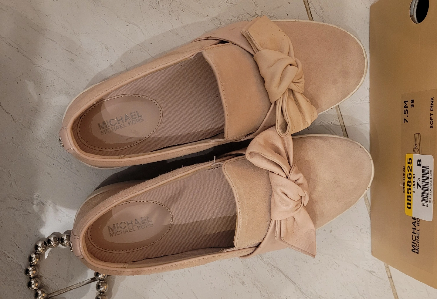 Selling a pair of Michael Kors Greer slip-on shoes in size 7.5. They're a soft pink colour and come with the original box.