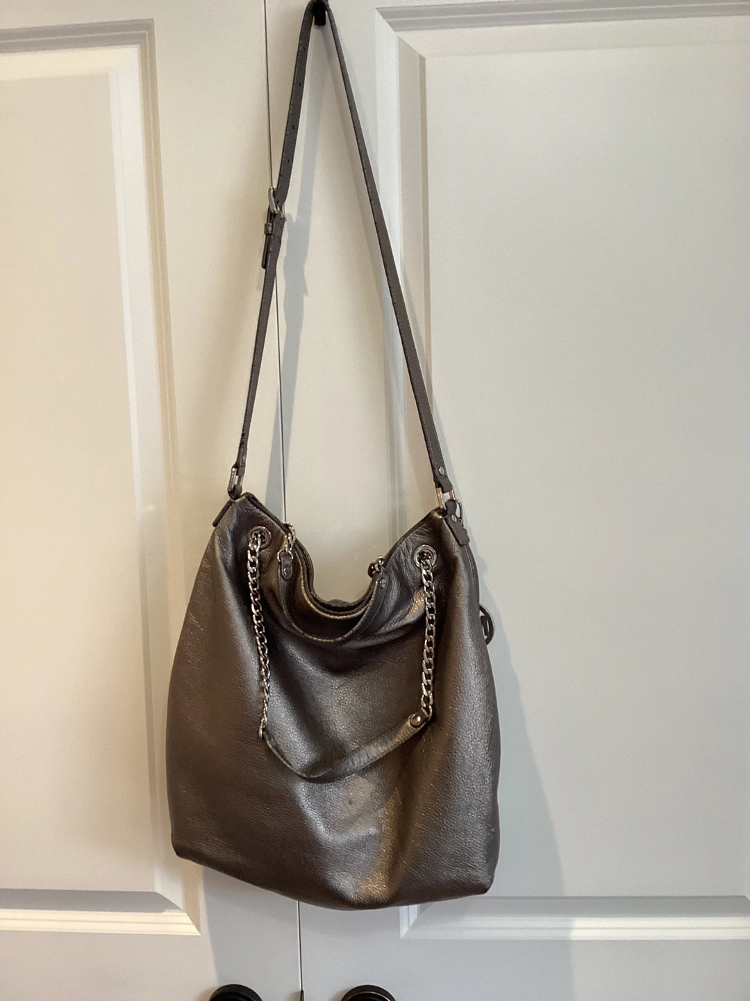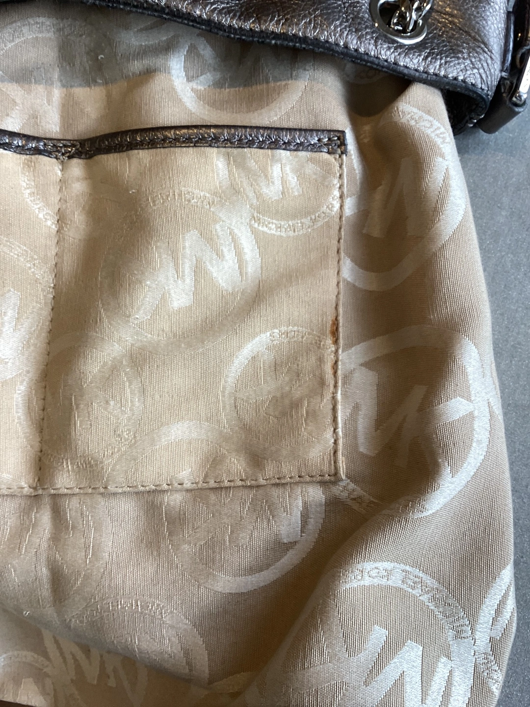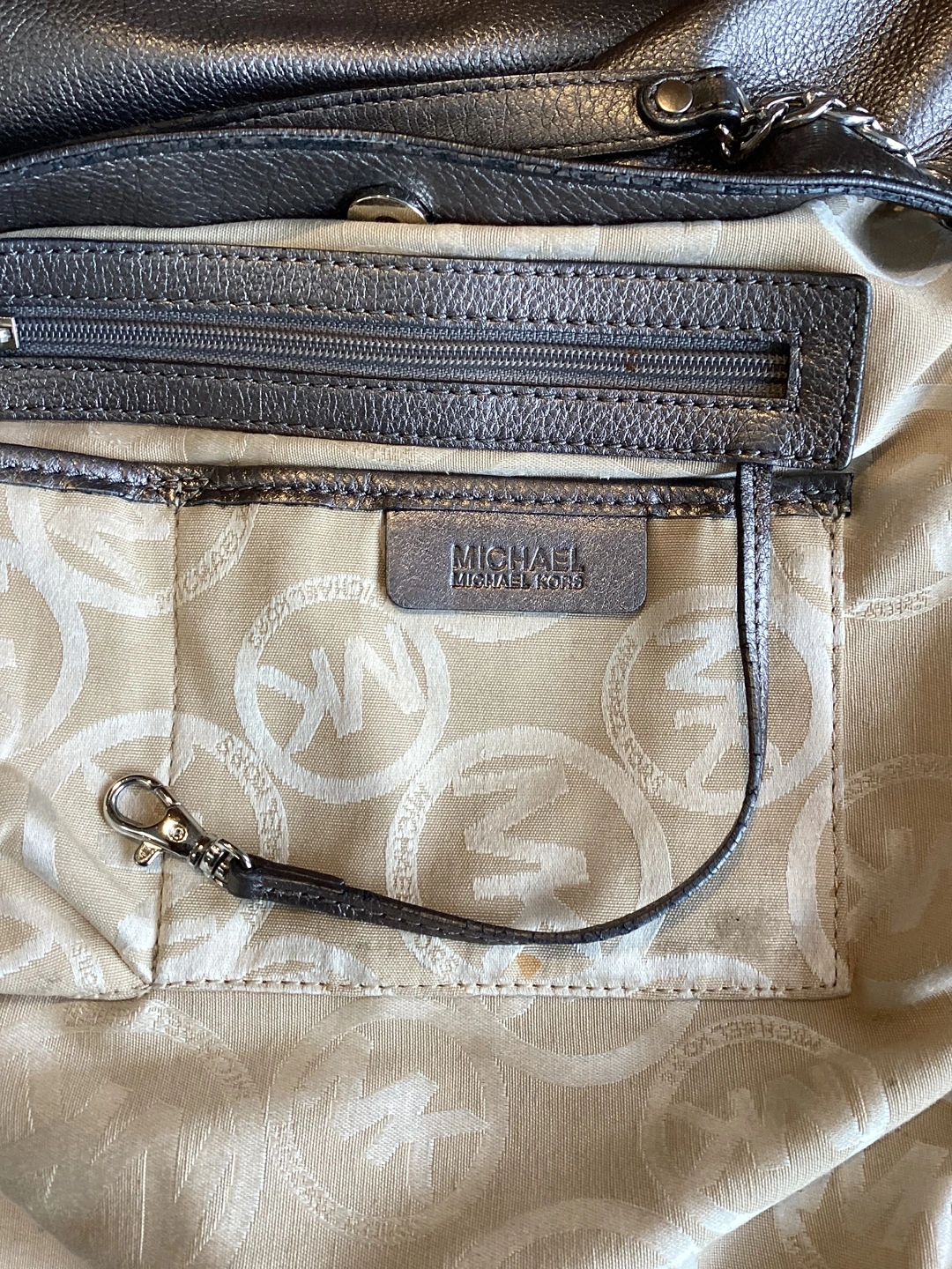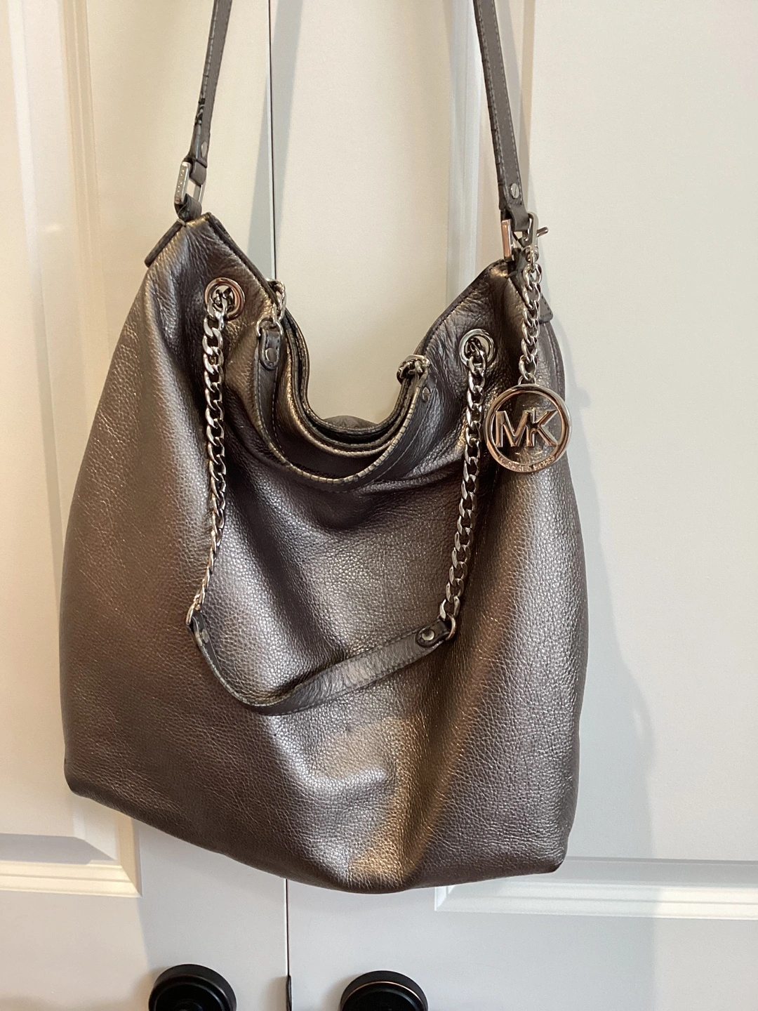Michael Kors Handbag, there are some imperfections - the handles are showing wear, some marks on the pebble leather, some staining on the lining - see pics, can be carried as a tote or worn crossbody, snap top closure, inside key strap’ approximate size 13”W X 14”H X 2 1/2”. $40 or best offer.