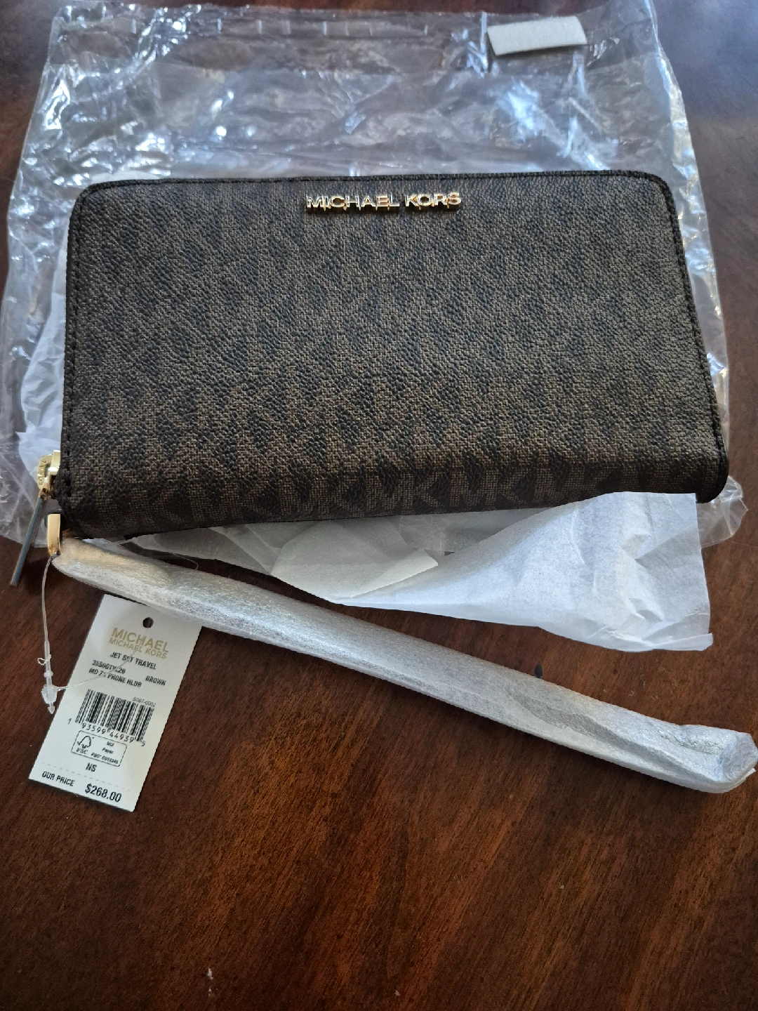 This is a brand new Michael Kors Jet Set Travel wallet in brown. It's still in its original packaging. The original price was $268. It's a stylish and practical accessory to keep your essentials organized Cash and meet up at Bellamy and Eglinton Ave. East