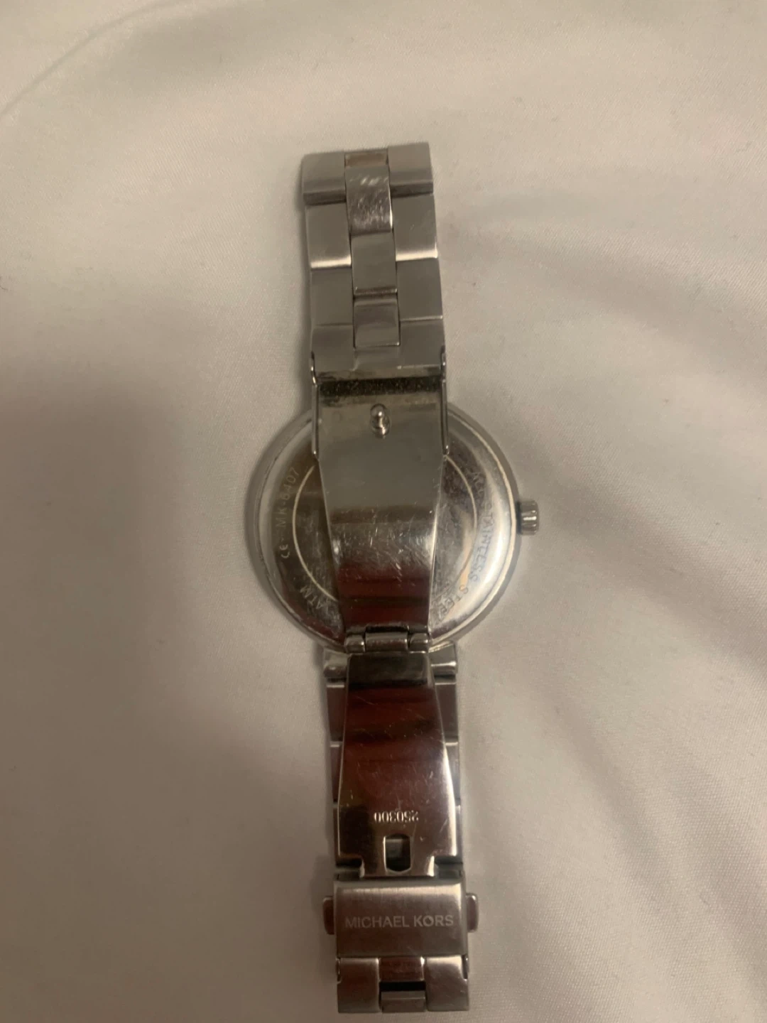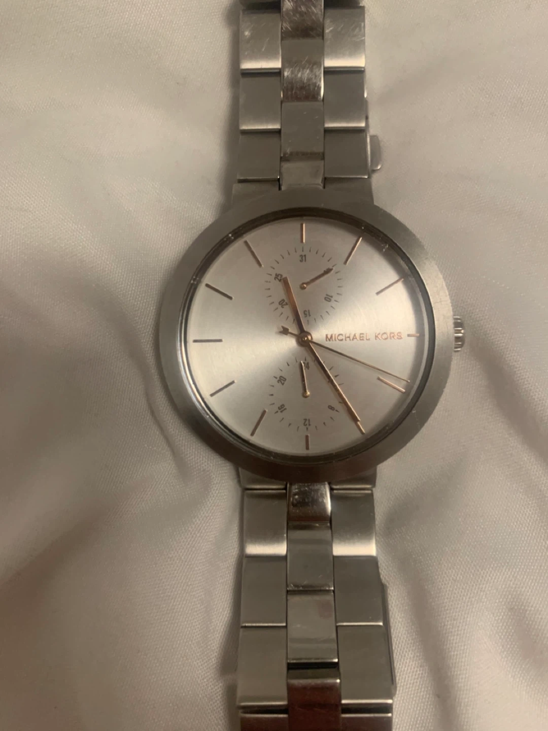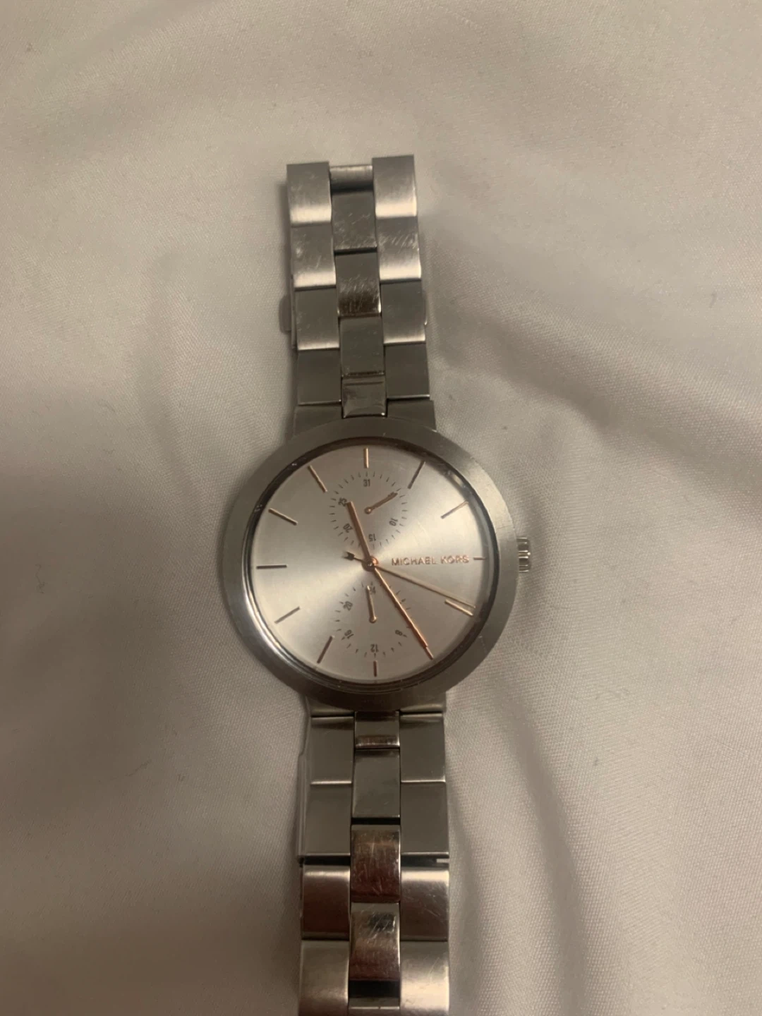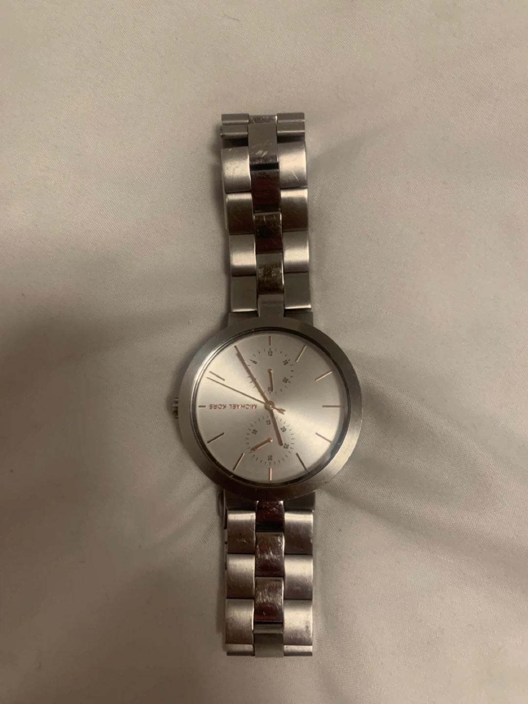 Selling a ladies Michael Kors watch in silver. It's in great condition and ready for a new home. The watch features a stainless steel band and a classic design that's perfect for any occasion