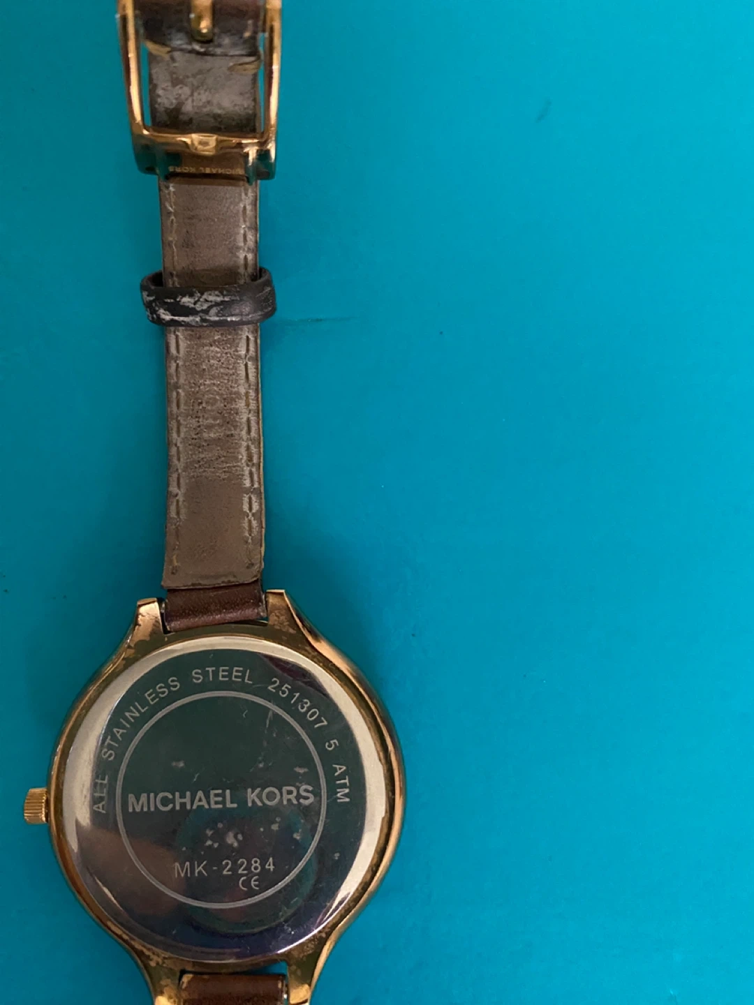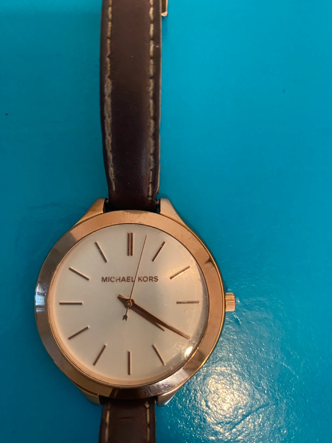 Selling a used Michael Kors ladies watch. It has a brown leather strap and a gold-tone case with a white face. It's in good condition and would make a stylish addition to any outfit!