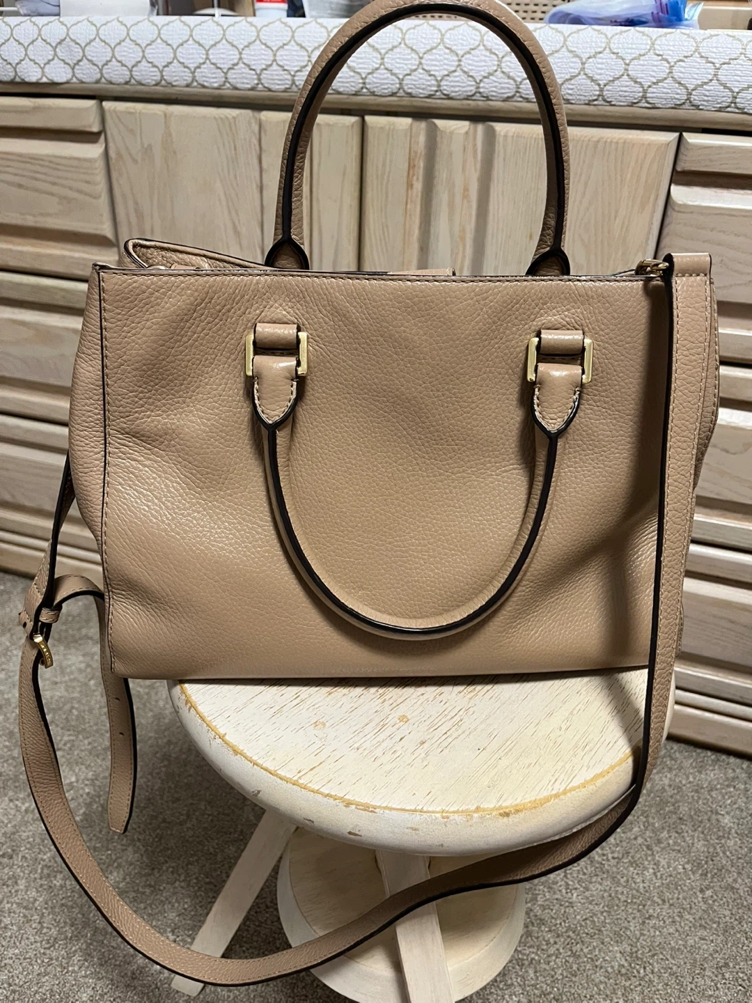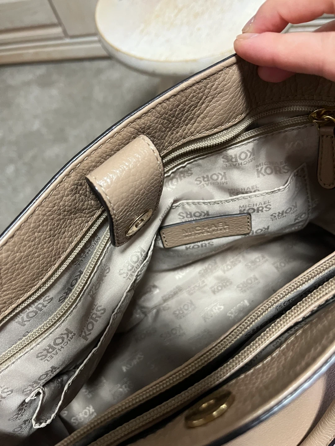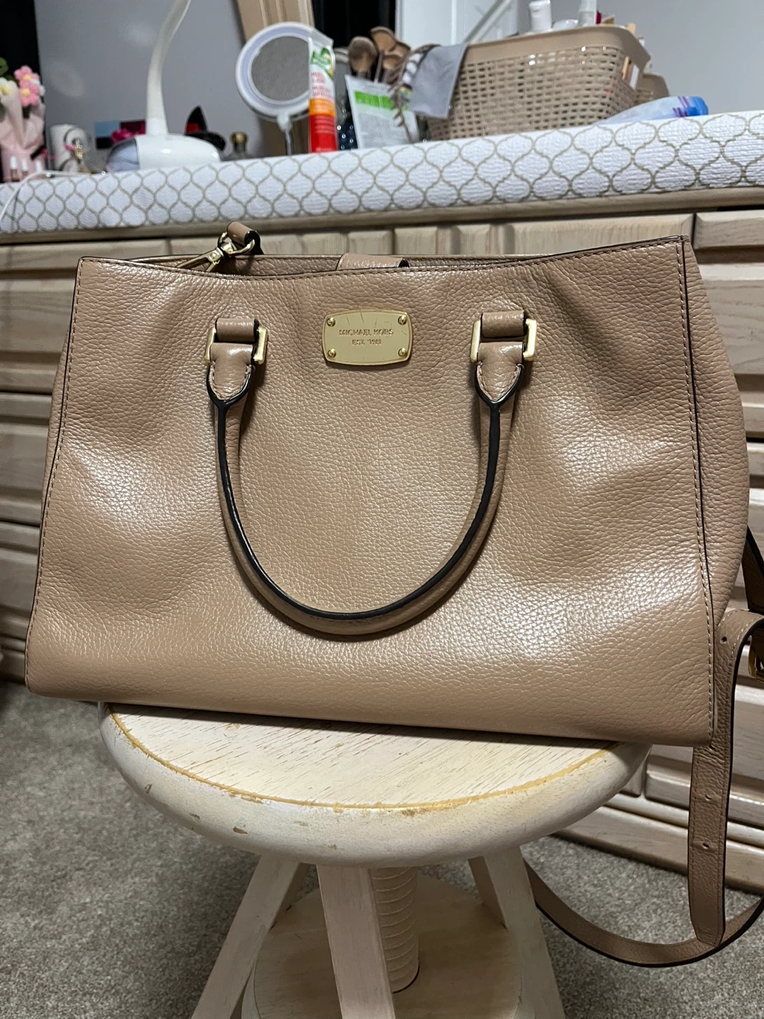 Selling a gently used Michael Kors satchel. It's a lovely beige colour and made of leather. Great for everyday use!