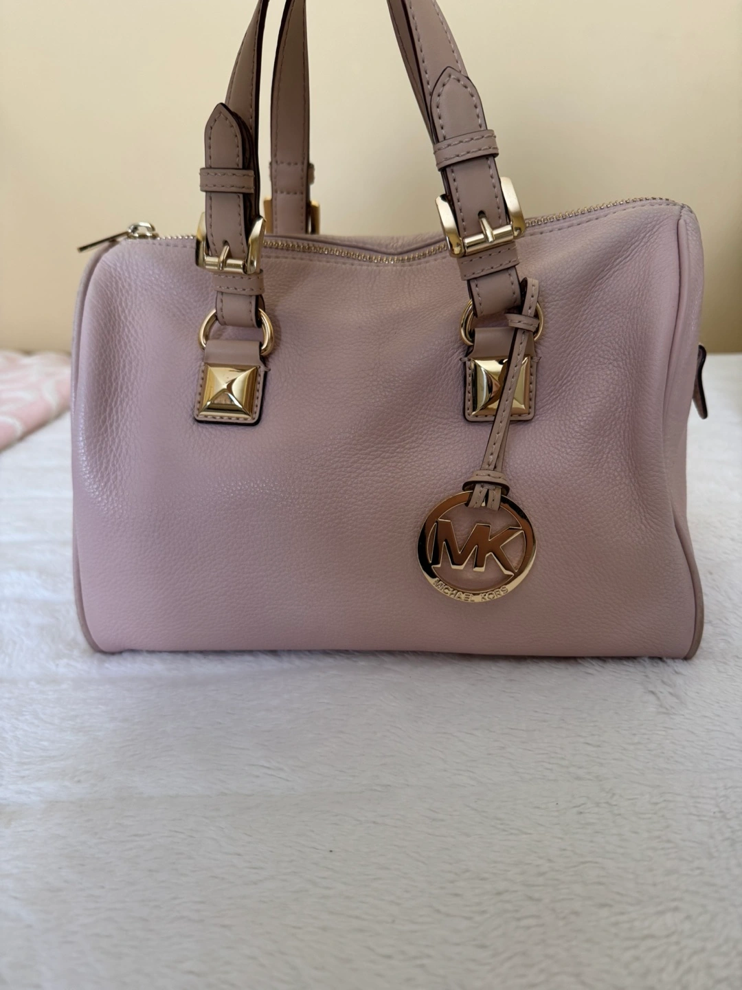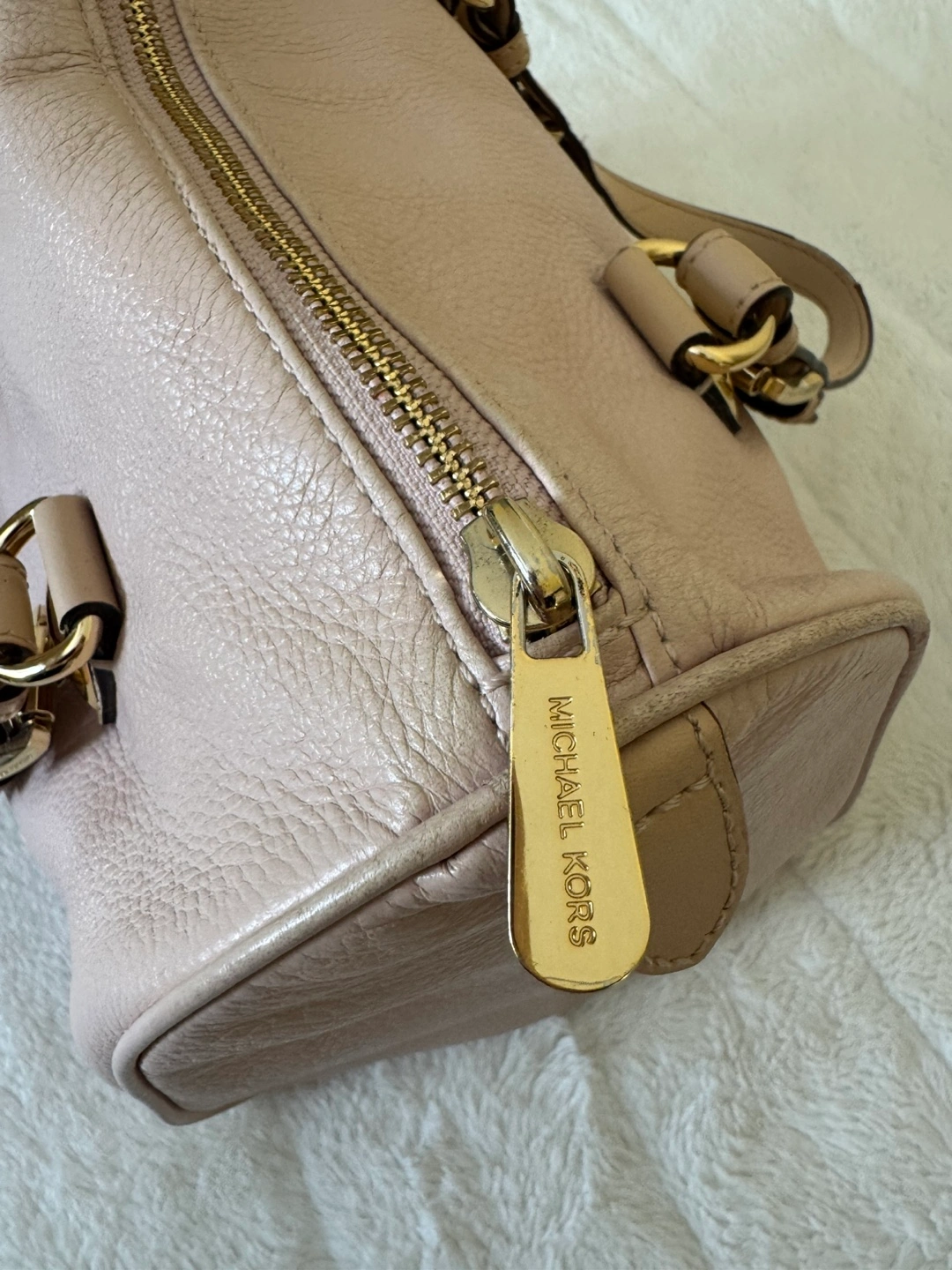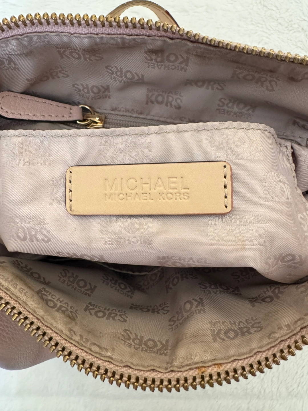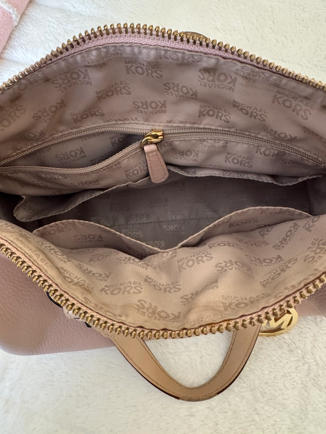 Michael Kors Light Pink Purse With Gold Accent - Features: Genuine leather medium sized purse with good quality zipper, plenty of main compartment room as well as 4 small pockets and 1 larger zipper compartment. Has gold accents as well as the classic gold Michael Kors medallion displayed on the bag. - Colour: Light pink with gold accents (listed as colour “Soft Pink” on website) - Condition: gently used with wear on the bag handles. Besides that, is always stuffed and preserved in a dust bag. Good condition. - Price: Purchased for $398 accepting cash or e-transfer available for pick up or drop off *far distances from location may be charged a $5.00 fee) all clothing is washed before pickup/drop off