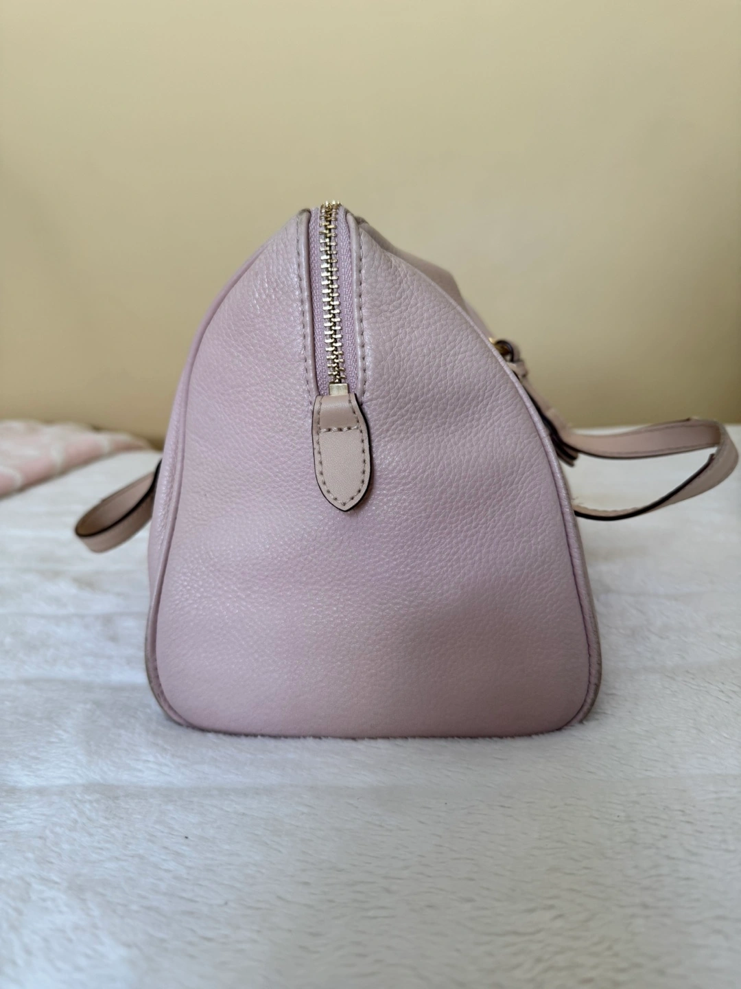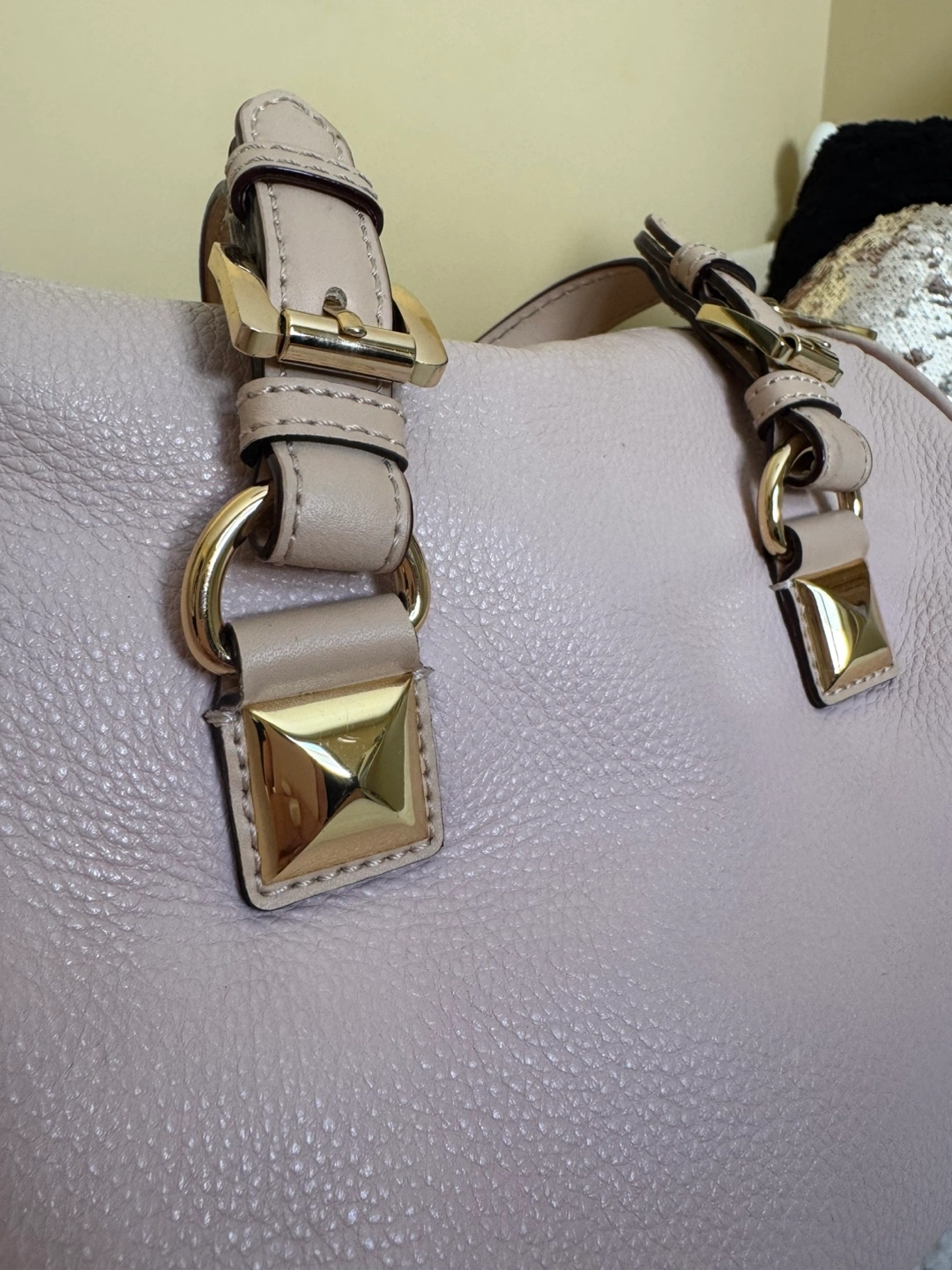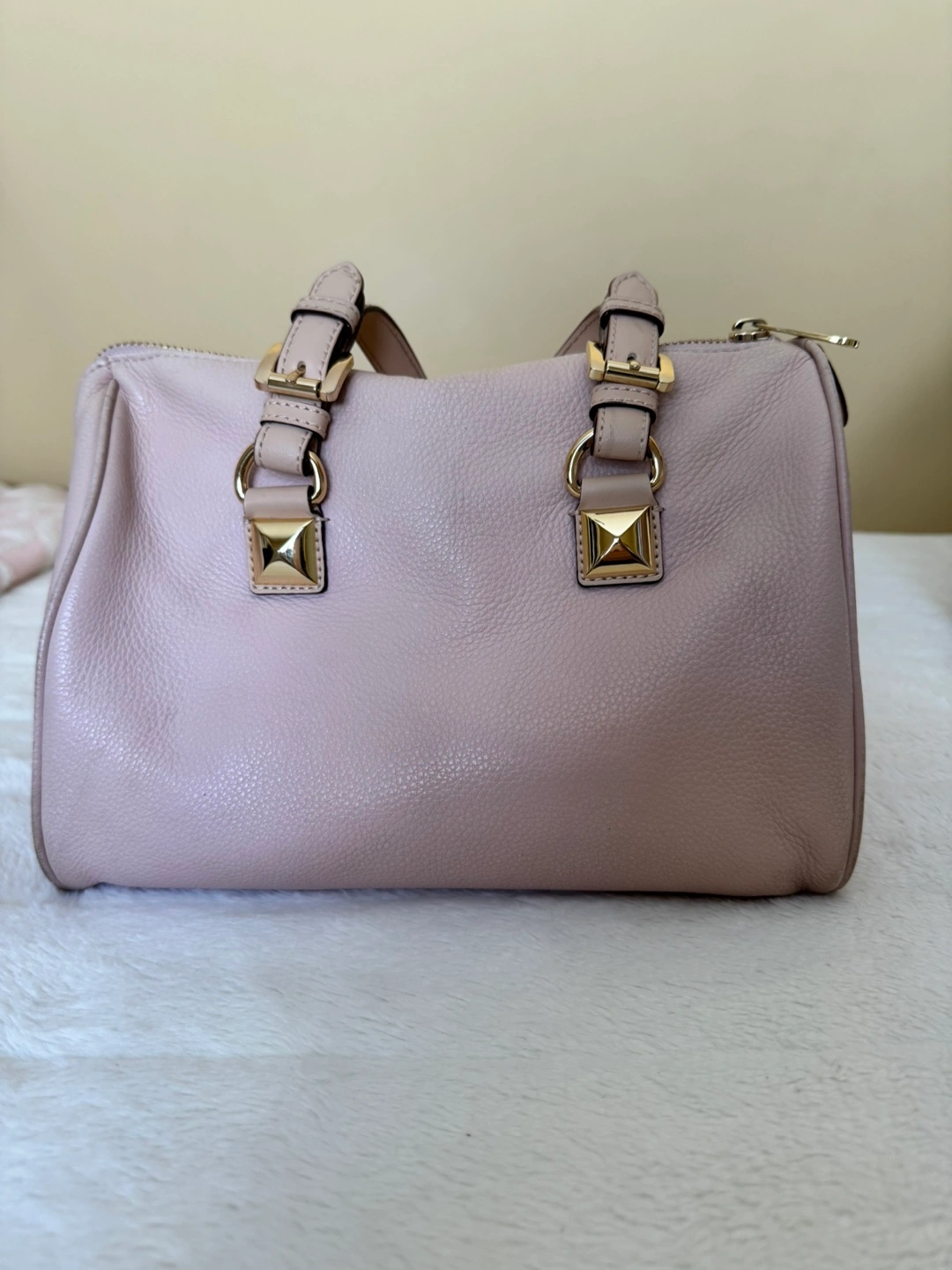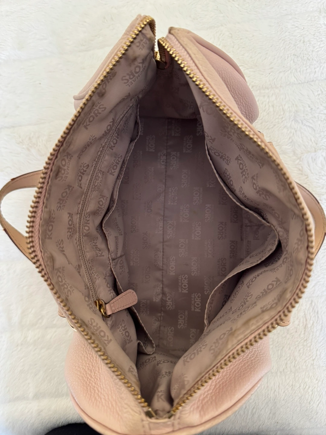 Michael Kors Light Pink Purse With Gold Accent - Features: Genuine leather medium sized purse with good quality zipper, plenty of main compartment room as well as 4 small pockets and 1 larger zipper compartment. Has gold accents as well as the classic gold Michael Kors medallion displayed on the bag. - Colour: Light pink with gold accents (listed as colour “Soft Pink” on website) - Condition: gently used with wear on the bag handles. Besides that, is always stuffed and preserved in a dust bag. Good condition. - Price: Purchased for $398 accepting cash or e-transfer available for pick up or drop off *far distances from location may be charged a $5.00 fee) all clothing is washed before pickup/drop off
