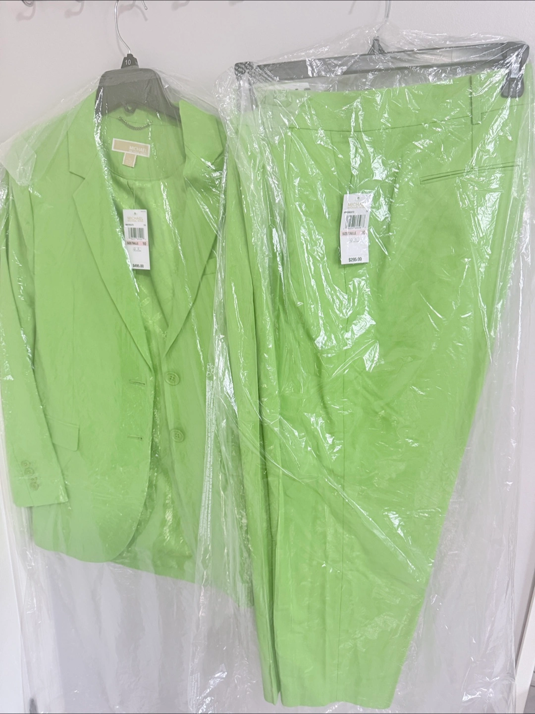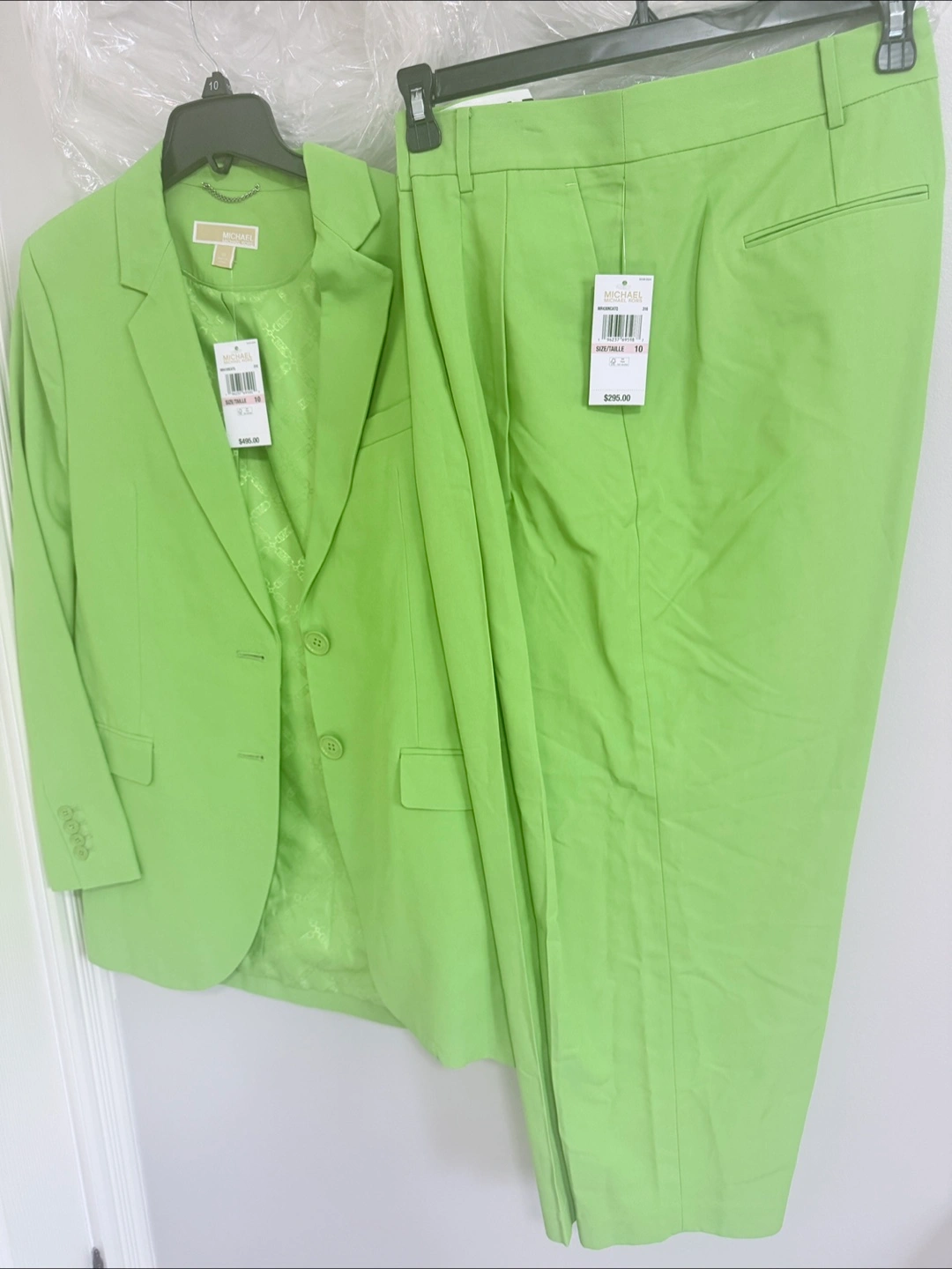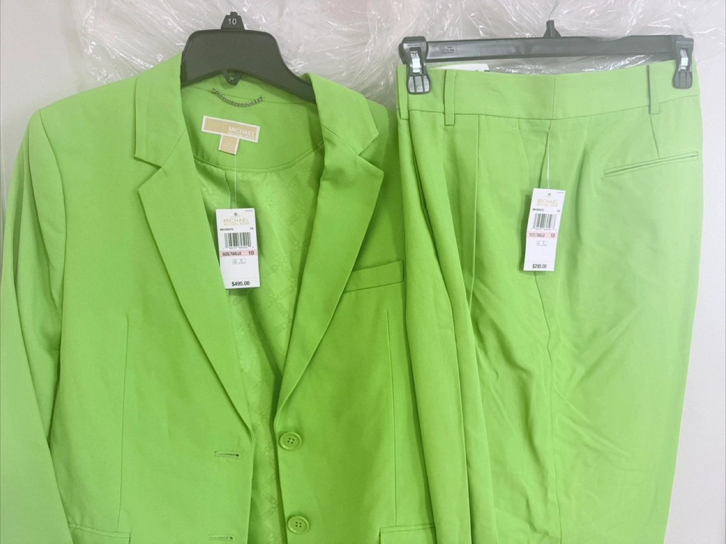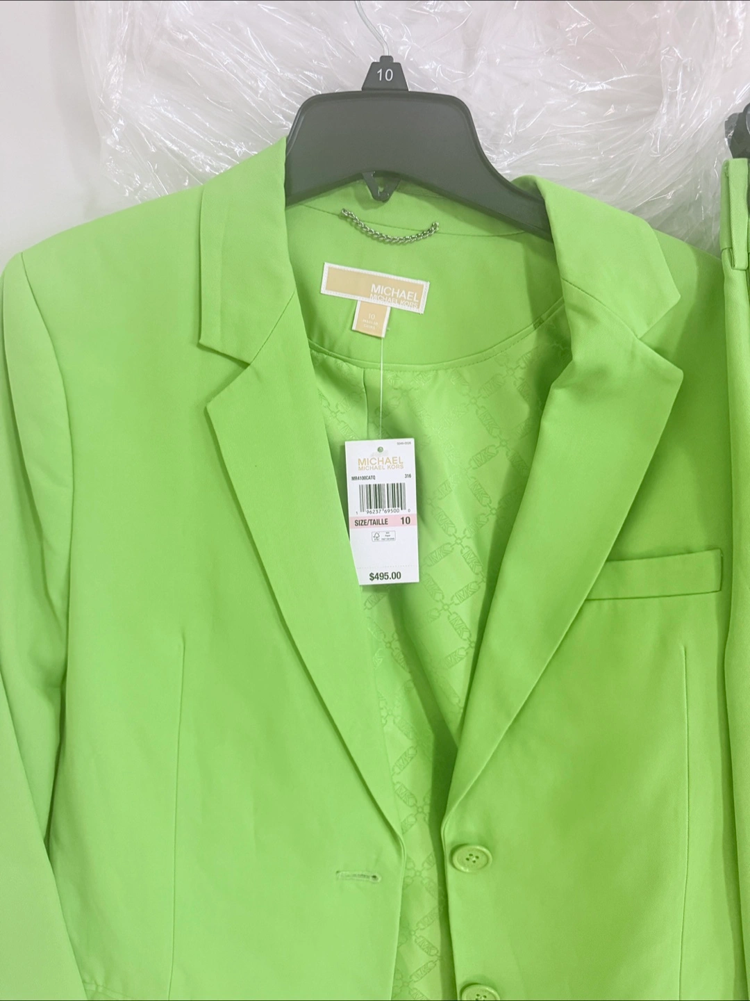 Selling a very stylish Michael Kors suit in a vibrant lime green colour! The suit is a size 10 and includes both the blazer and matching pants. The original price was $495 for the blazer and $295 for the pants. It's a beautiful set for any occasion!