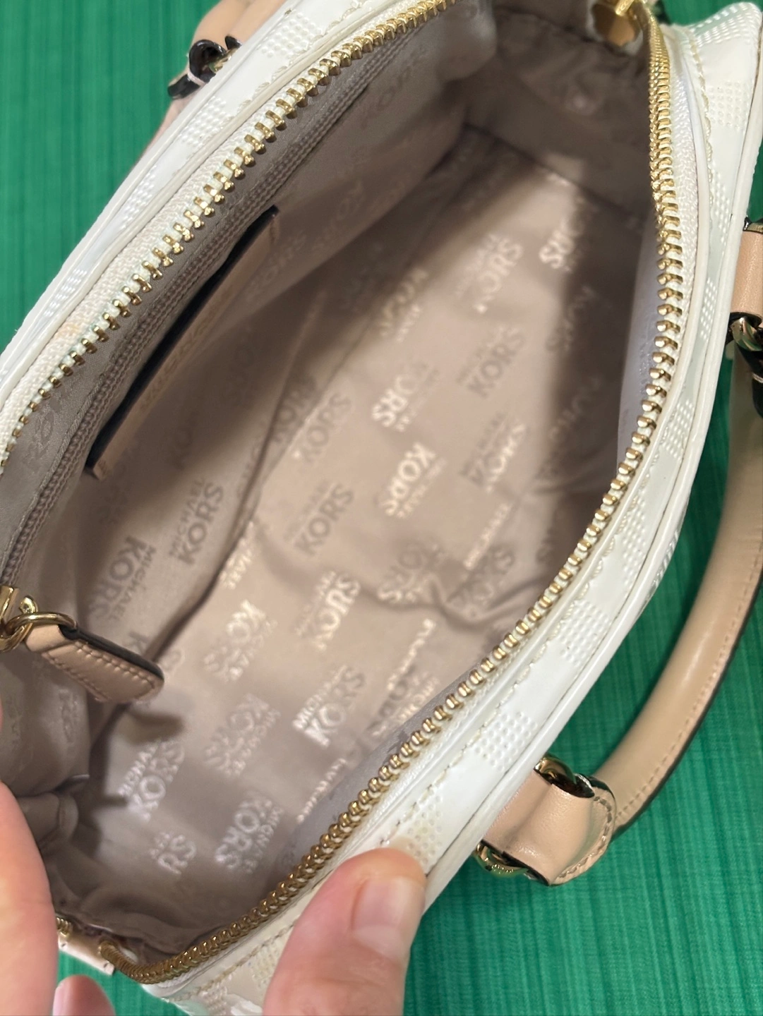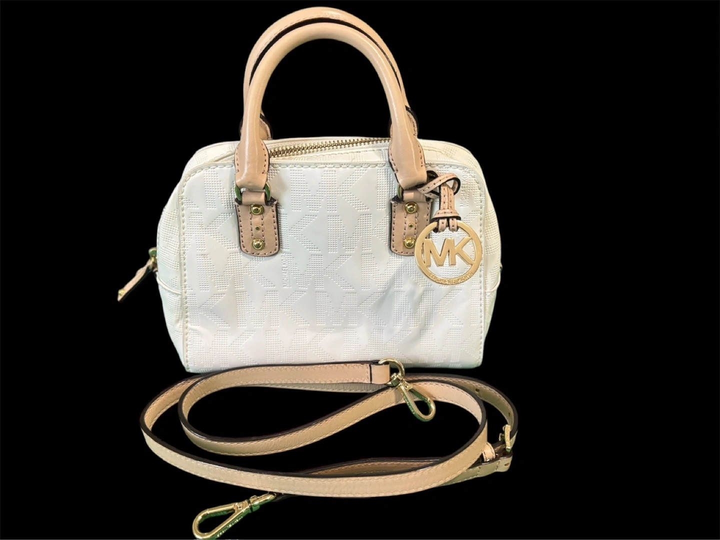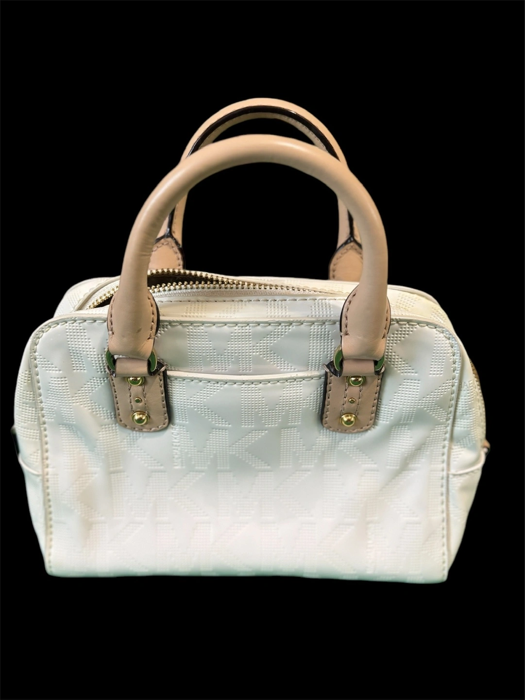 Adorable white satchel handbag. Features an embossed MK logo, beige handles and shoulder strap. Top zipper closure. Small size, perfect for everyday use. Pick up in Vancouver