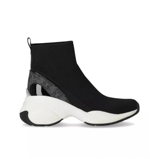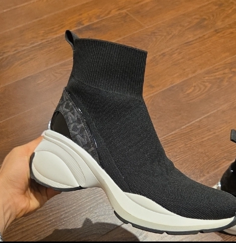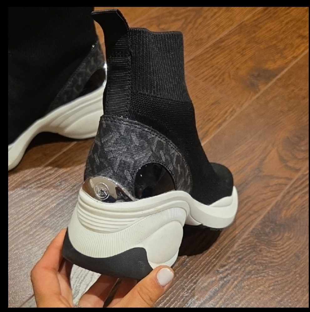 These Michael Kors sock sneakers are in new condition! They're black with a white sole and have a cool, modern look. Perfect for adding a bit of sporty style to your everyday outfits. Only tried on at home but missed a return window.