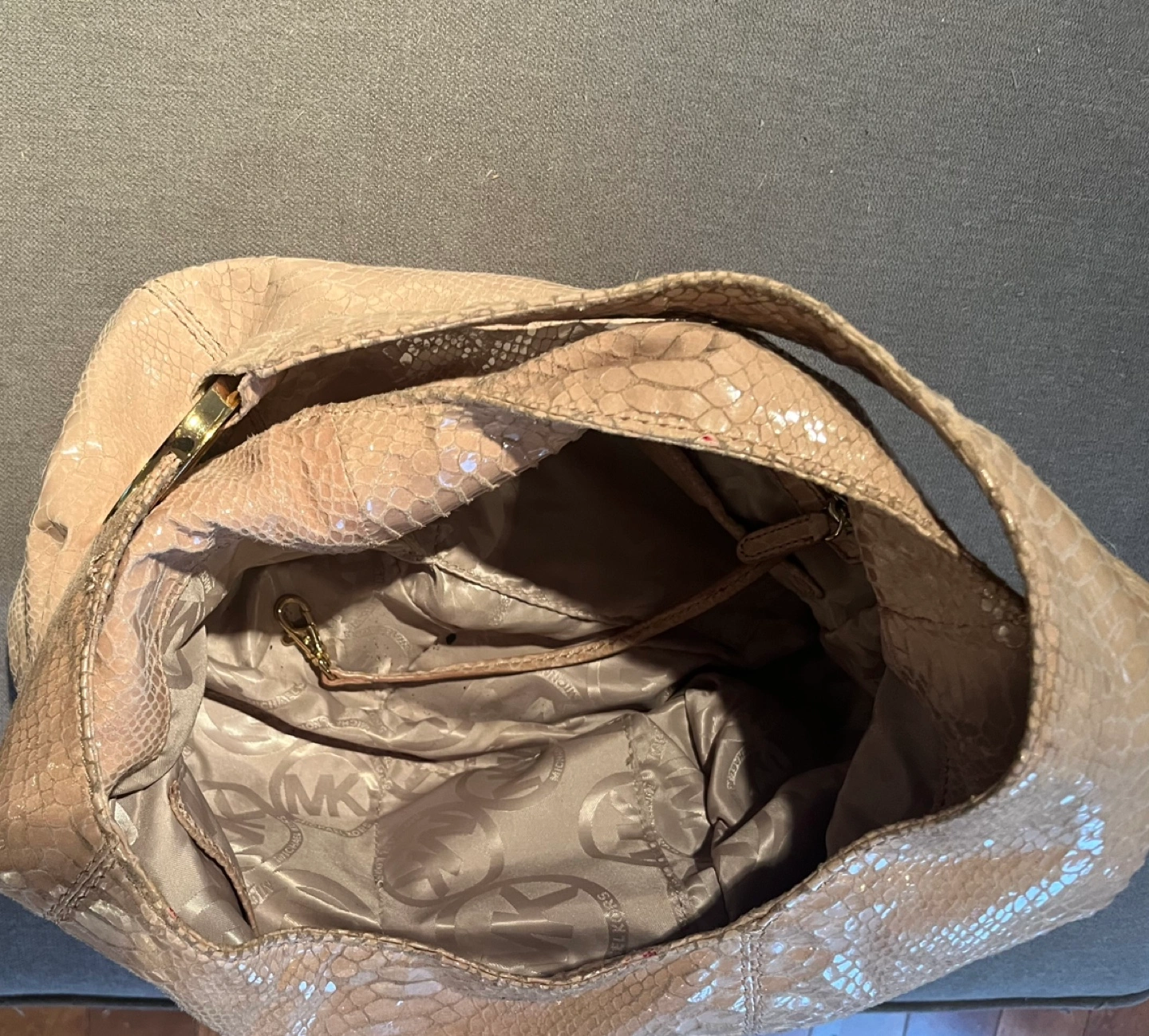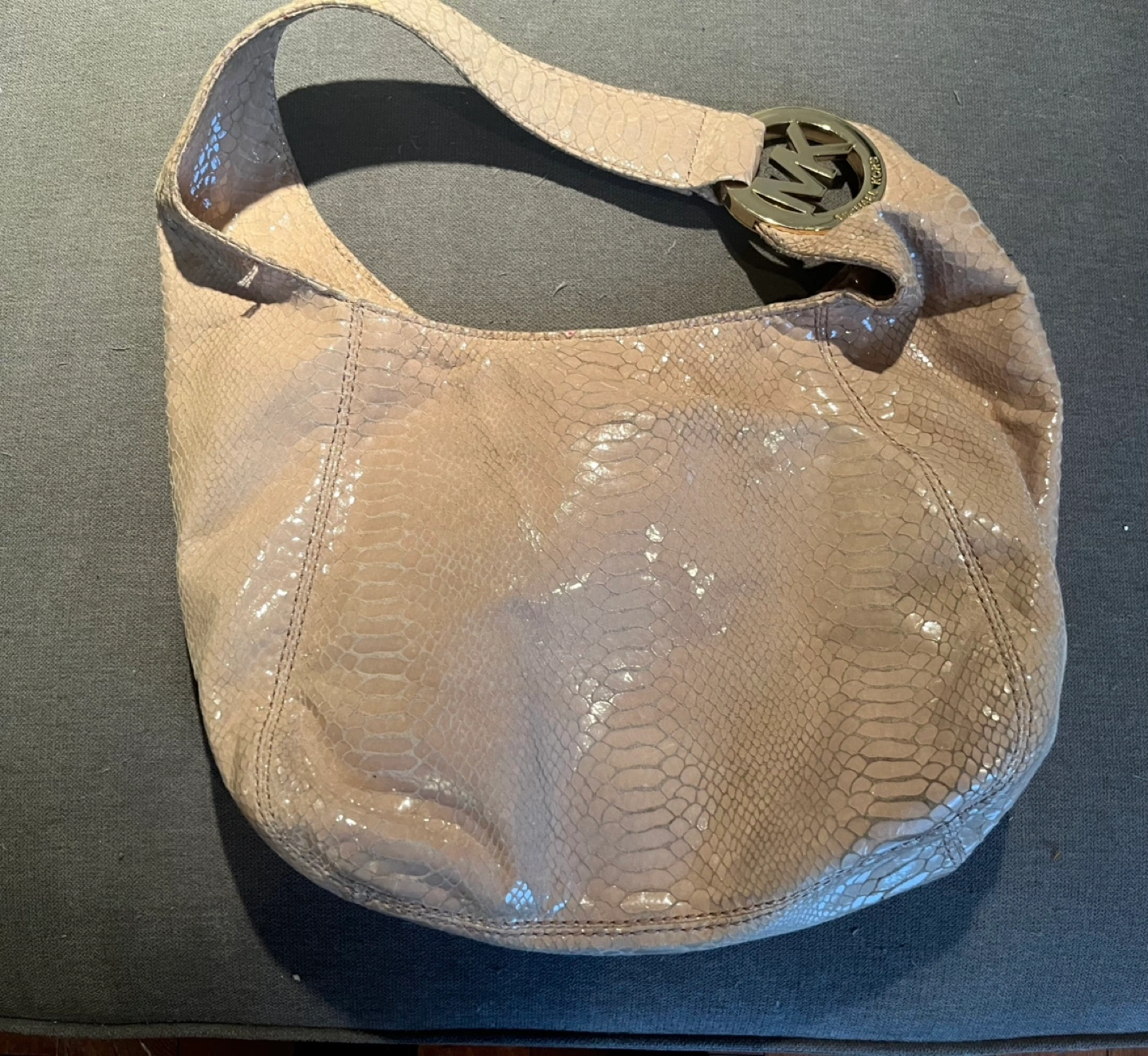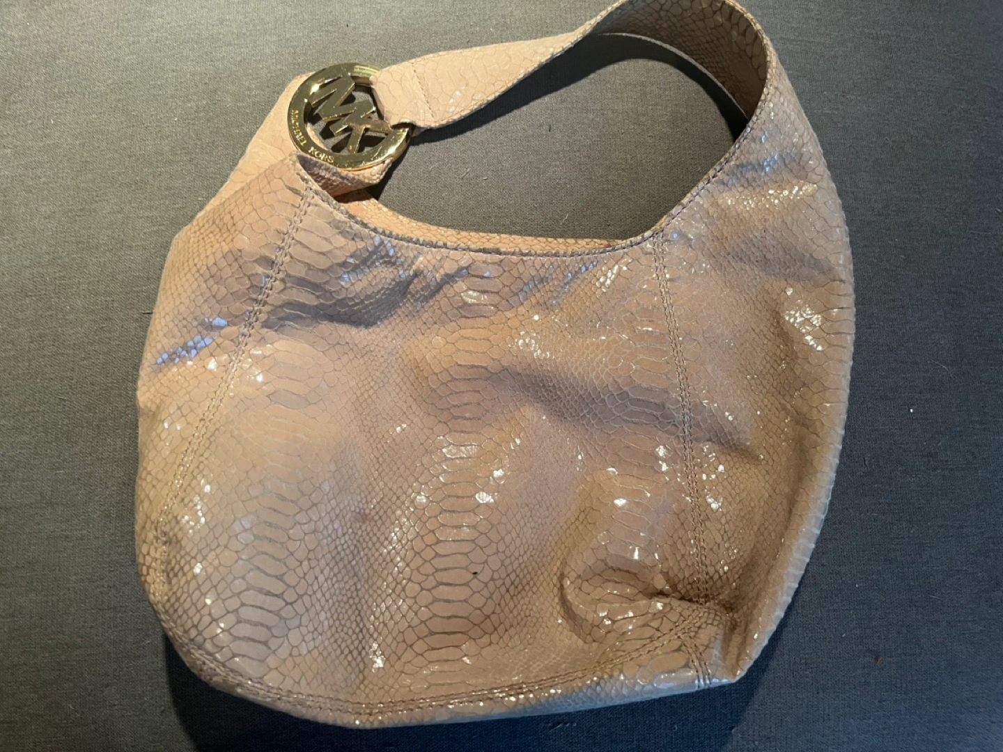 Large Michael Kors snakeskin purse with gold hardware and a large MK logo on the front. The bag has one main compartment with a zipper closure and a small zippered pocket inside.