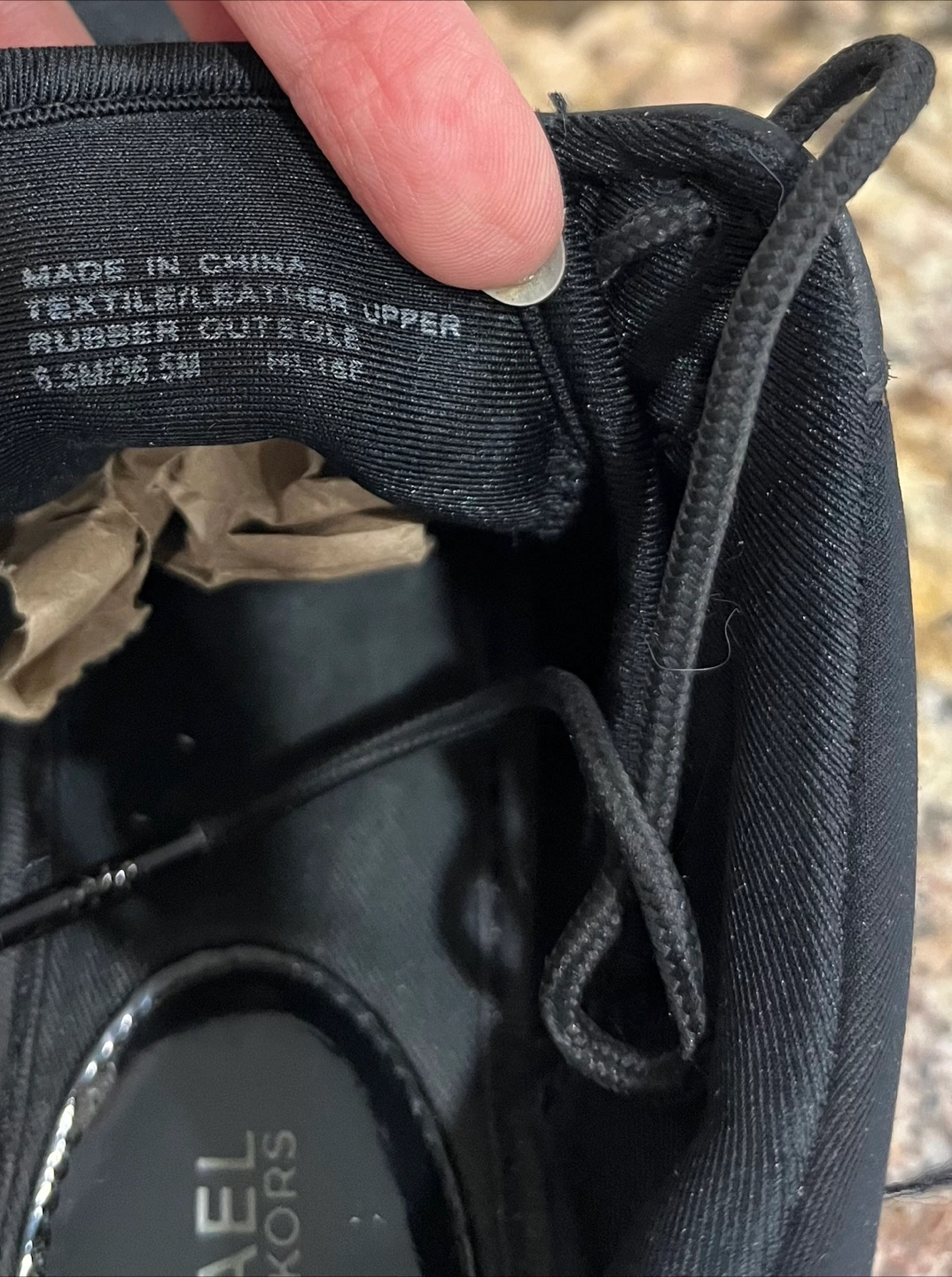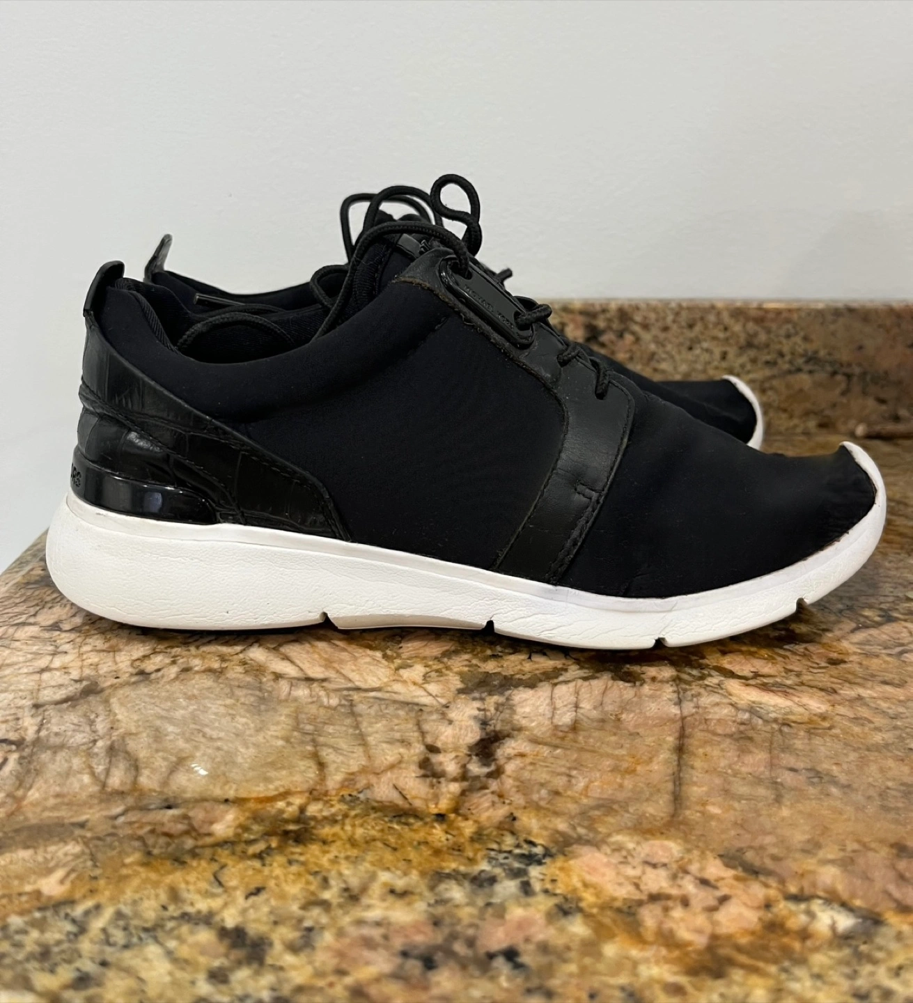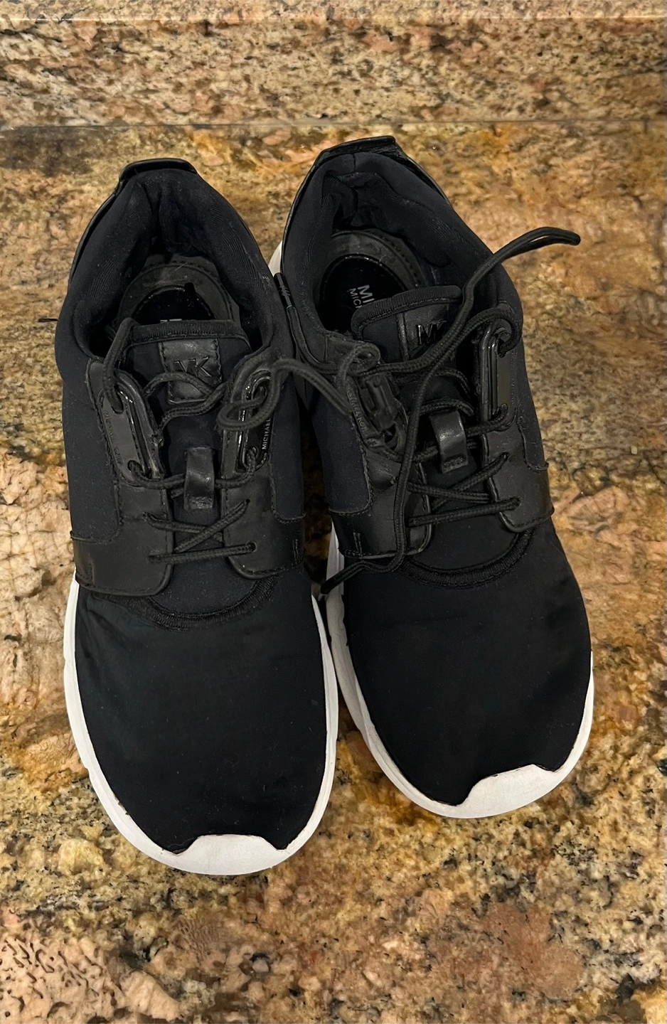 Black sneakers with white soles. Laces with a loop detail. Perfect for a peaceful walk outside.