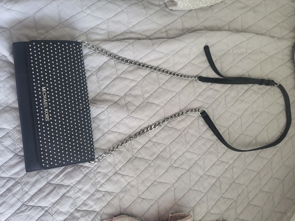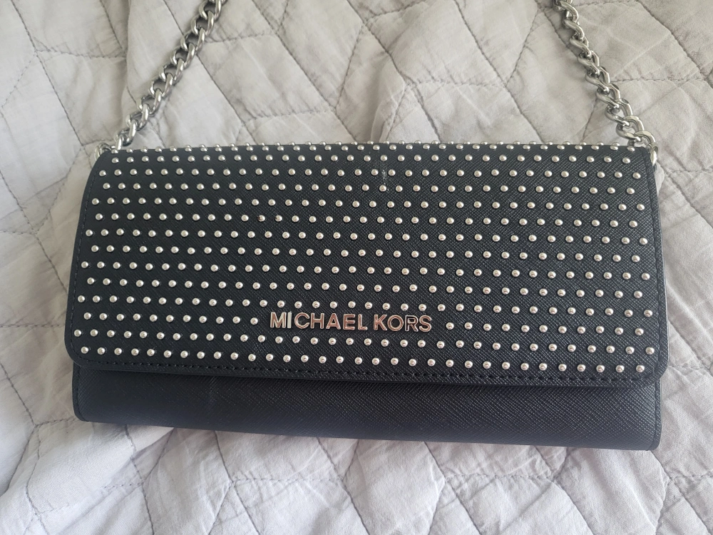 Black chain wallet with a silver chain strap. The wallet is studded with silver accents. The wallet has multiple pockets and slots for cards and cash.