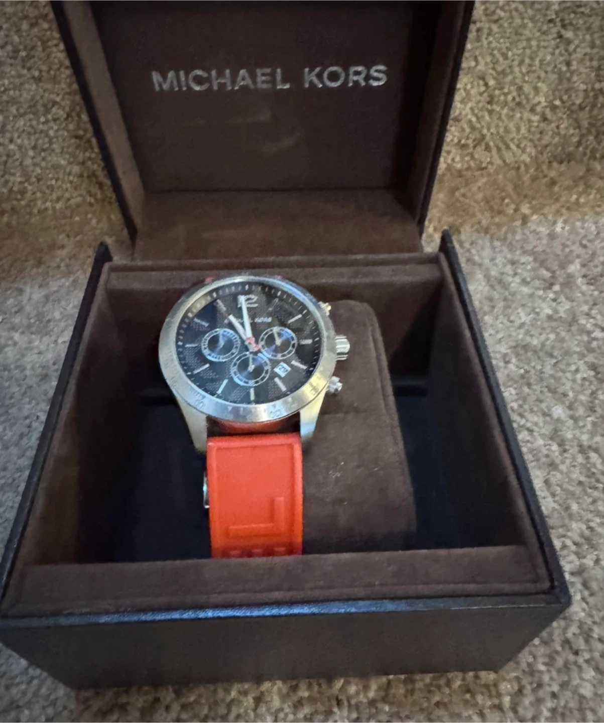Selling a Michael Kors watch. It features a black face and a vibrant orange band. The watch comes with its original box. Need new battery