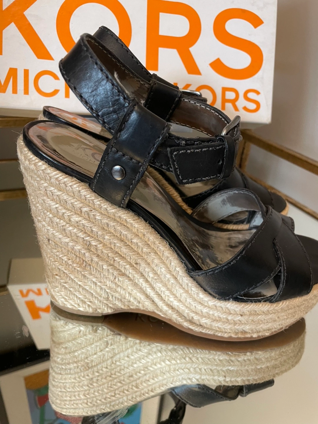 These Michael Kors wedge sandals are in great condition and come with the original box! They're a size 8 and feature a cute black strappy design with a jute wedge heel. Perfect for adding a bit of height and style to your summer outfits! Located in Osborne Village with easy access to driveway for pickup . Selling a pair of Michael Kors wedge sandals with leather straps . In good condition. The leather and wedge are not torn or scuffed . Called Violet. Size 8 medium. You are welcome to try on before purchase in my well lit comfortable lobby . Perfect for summer and those winter getaways . If you would like an affordable pair of Kors shoes these are for you . Accepting etransfer for guaranteed hold and cash is FCFS Please see my other listings as I am downsizing. Thanks