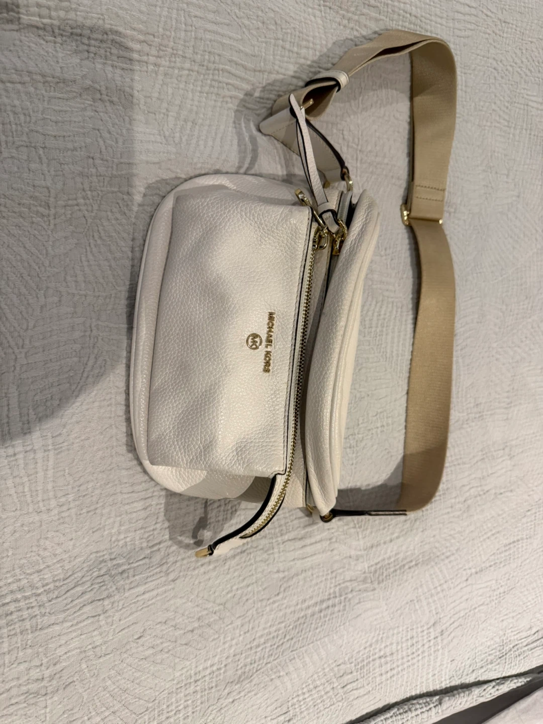 Selling a Michael Kors slater belt bag in white leather. It has a gold zipper and an adjustable strap. Great for everyday use!
