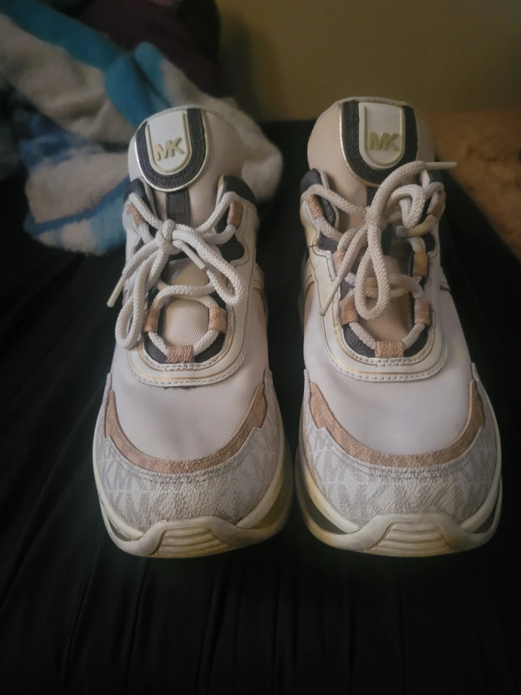 Selling a pair of Michael Kors women's sneakers. They feature a unique design with gold accents and the MK logo pattern. They're perfect for adding a touch of style to your everyday look!